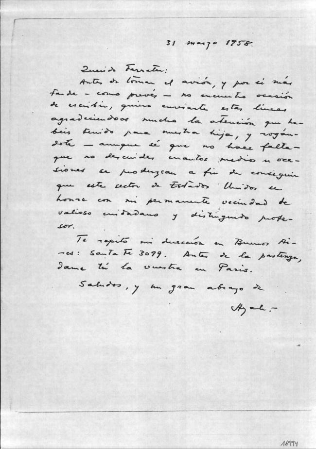 Antes de tomar el avión, y por si más tarde –como prevés– no encuentro ocasión de escribir, quiero enviarte estas líneas agradeciendoos mucho la atención que habeis tenido para nuestra hija, y rogándote –aunque sé que no hace falta– que no descuides cuantos medios u ocasiones se produzcan a fin de conseguir que este sector de Estados Unidos se honre con mi permanente vecindad de valioso ciudadano y distinguido profesor.