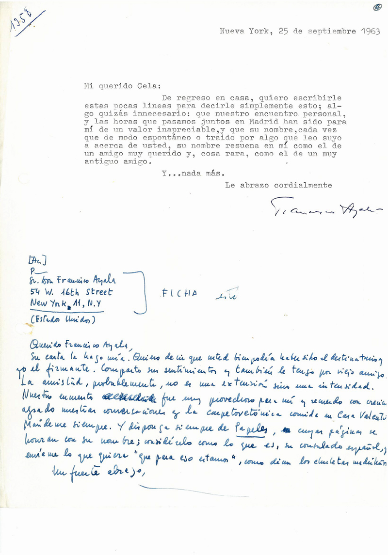 Carta de Francisco Ayala a Camilo José Cela (25/09/1963)