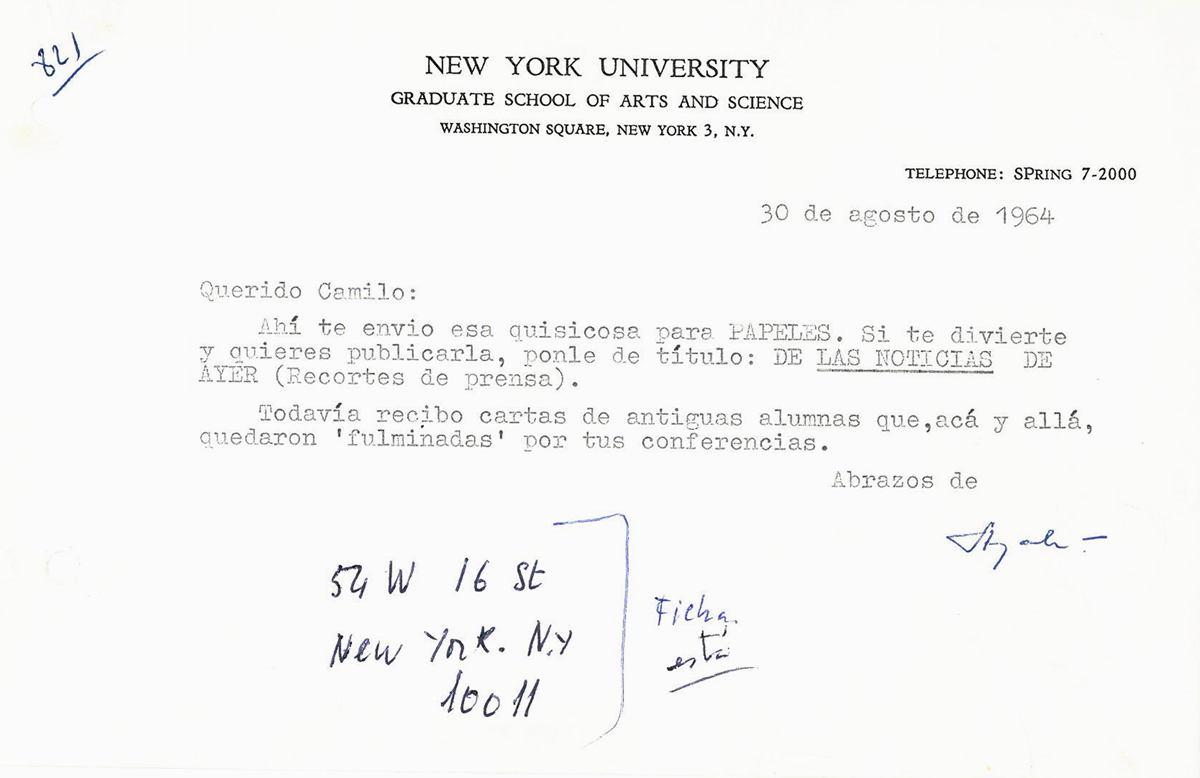 Perdone que no le haya contestado antes a su carta, que le agradecí mucho. Es verdad, que estos dias últimos, y podría decir semanas mejor, han sido de un trabajo enorme para mí, pues el final del curso se ha complicado esta vez con el hecho de que, a principios del próximo, paso a la New York University, que me conviene más desde muchos puntos de vista, y eso me ha obligado a gestiones diversas y fastidiosas.