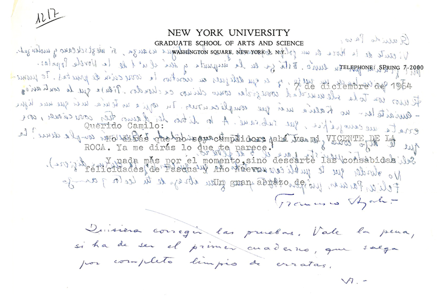 Carta de Francisco Ayala a Camilo José Cela (07/12/1964)