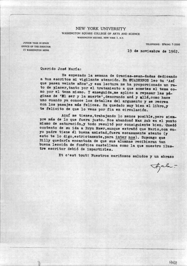 [Carta mecanografiada con firma autógrafa y con membrete:] NEW YORK UNIVERSITY / WASHINGTON SQUARE COLLEGE OF ARTS AND SCIENCE / WASHINGTON SQUARE, NEW YORK 3, N.Y. / JUNIOR YEAR IN SPAIN / OFFICE OF THE DIRECTOR / 15 WASHINGTON MEWS