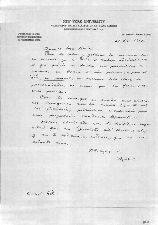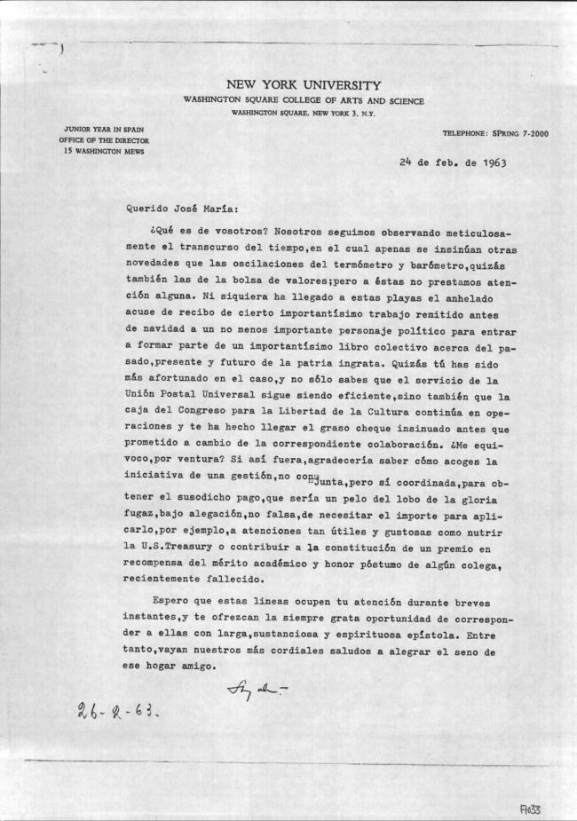 [Carta manuscrita con membrete:] NEW YORK UNIVERSITY / WASHINGTON SQUARE COLLEGE OF ARTS AND SCIENCE / WASHINGTON SQUARE, NEW YORK 3, N.Y. / JUNIOR YEAR IN SPAIN / OFFICE OF THE DIRECTOR / 15 WASHINGTON MEWS
