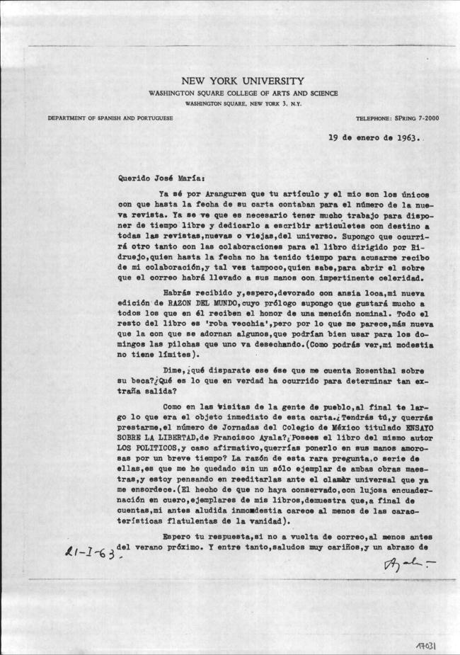 Carta de Francisco Ayala a José M.ª Ferrater Mora (19/01/1963)