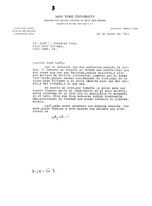 [Carta mecanografiada con firma autógrafa y con membrete:] NEW YORK UNIVERSITY / WASHINGTON SQUARE COLLEGE OF ARTS AND SCIENCE / WASHINGTON SQUARE, NEW YORK 3, N.Y. / JUNIOR YEAR IN SPAIN / OFFICE OF THE DIRECTOR / 15 WASHINGTON MEWS