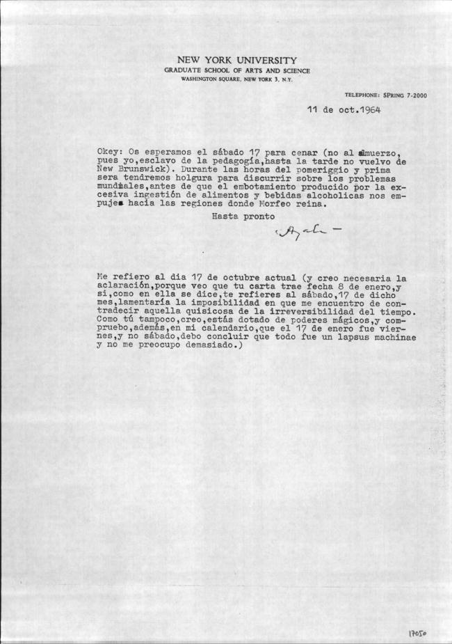 Me refiero al dia 17 de octubre actual (y creo necesaria la aclaración, porque veo que tu carta trae fecha 8 de enero, y si, como en ella se dice, te refieres al sábado, 17 de dicho mes, lamentaría la imposibilidad en que me encuentro de contradecir aquella quisicosa de la irreversibilidad del tiempo. Como tú tampoco, creo, estás dotado de poderes mágicos, y compruebo, además, en mi calendario, que el 17 de enero fue viernes, y no sábado, debo concluir que todo fue un lapsus machinae y no me preocupo demasiado.)