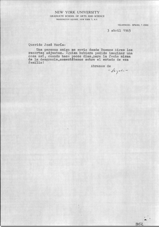 [Carta mecanografiada con firma autógrafa y con membrete:] NEW YORK UNIVERSITY / WASHINGTON SQUARE COLLEGE OF ARTS AND SCIENCE / WASHINGTON SQUARE, NEW YORK 3, N.Y. / DEPARTMENT OF ROMANCE & SLAVIC LANGUAGES AND LITERATURE