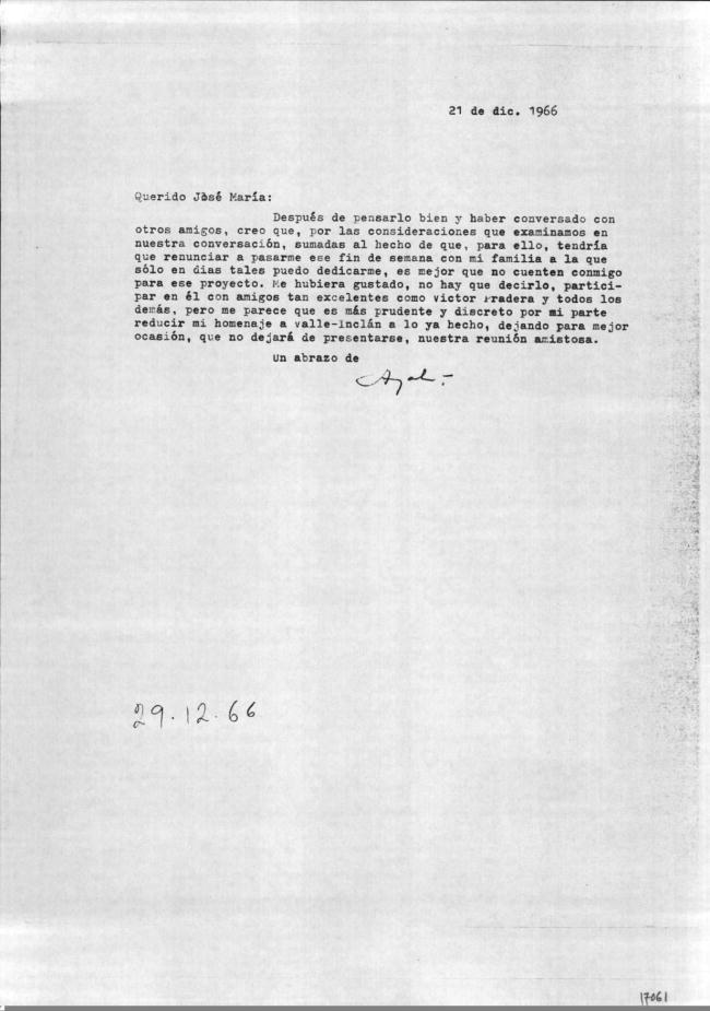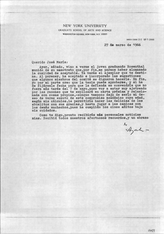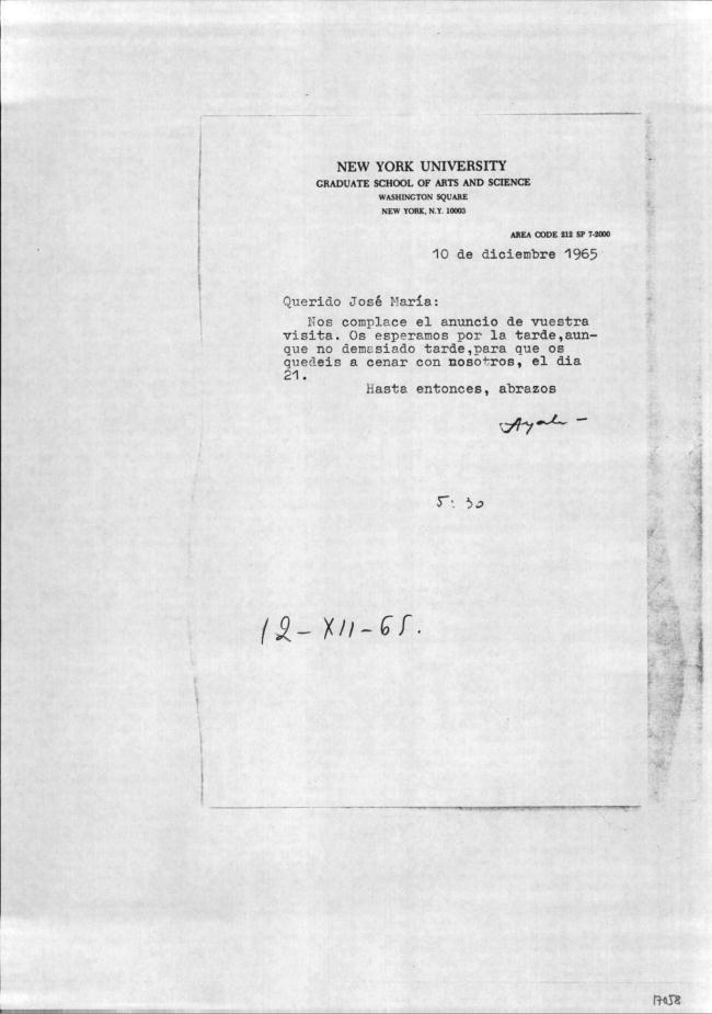 Carta de Francisco Ayala a José M.ª Ferrater Mora (18/04/1966)