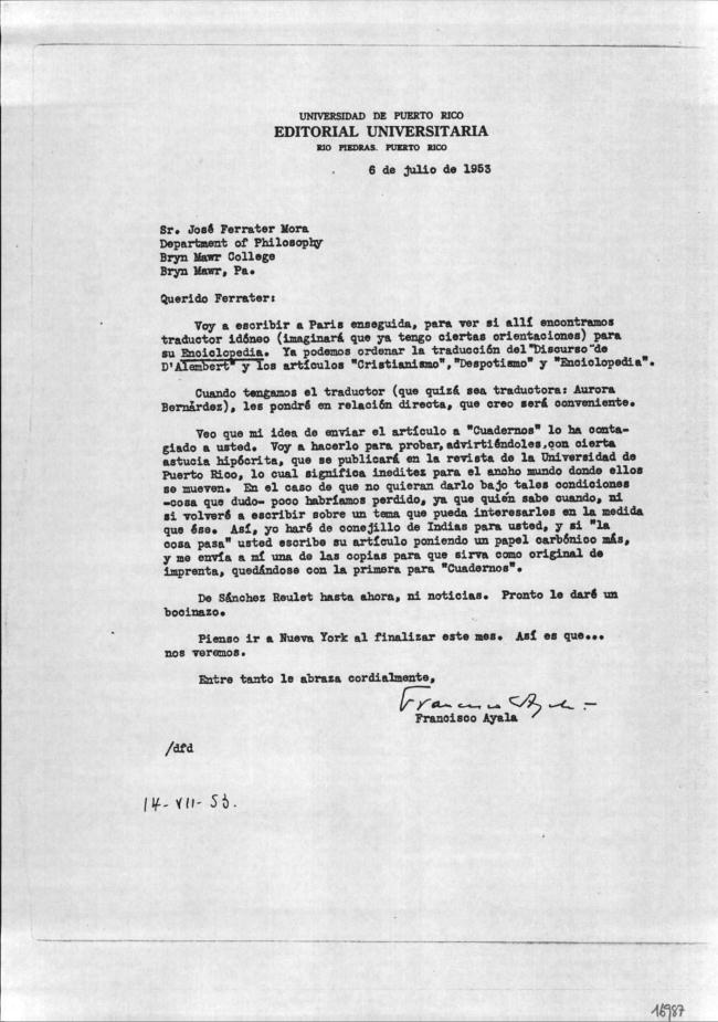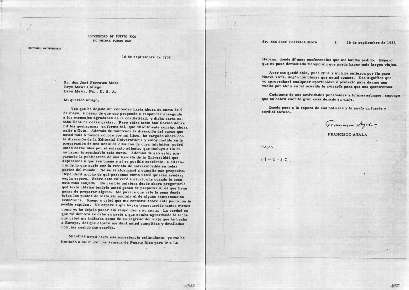 Carta de Francisco Ayala a José M.ª Ferrater Mora (16/09/1952)