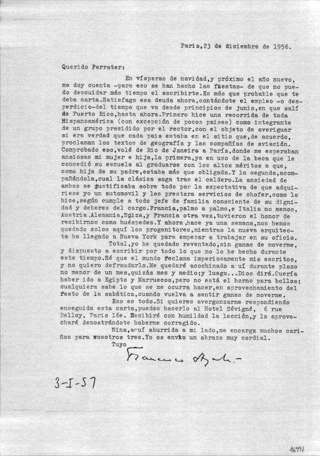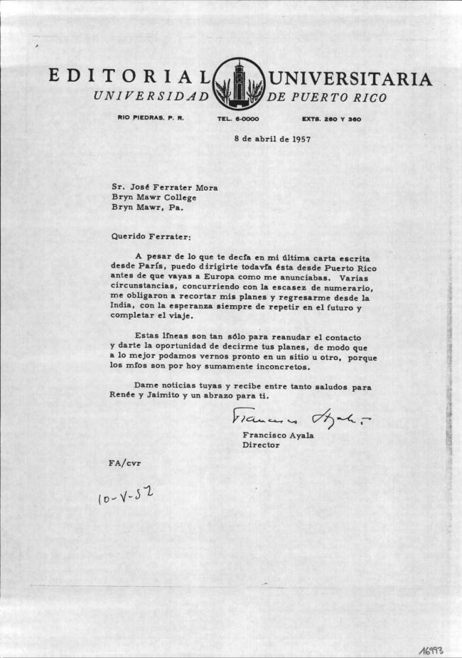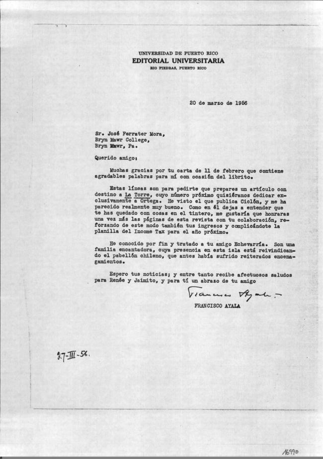 Carta de Francisco Ayala a José M.ª Ferrater Mora (20/03/1956)