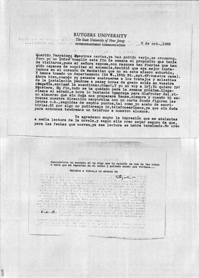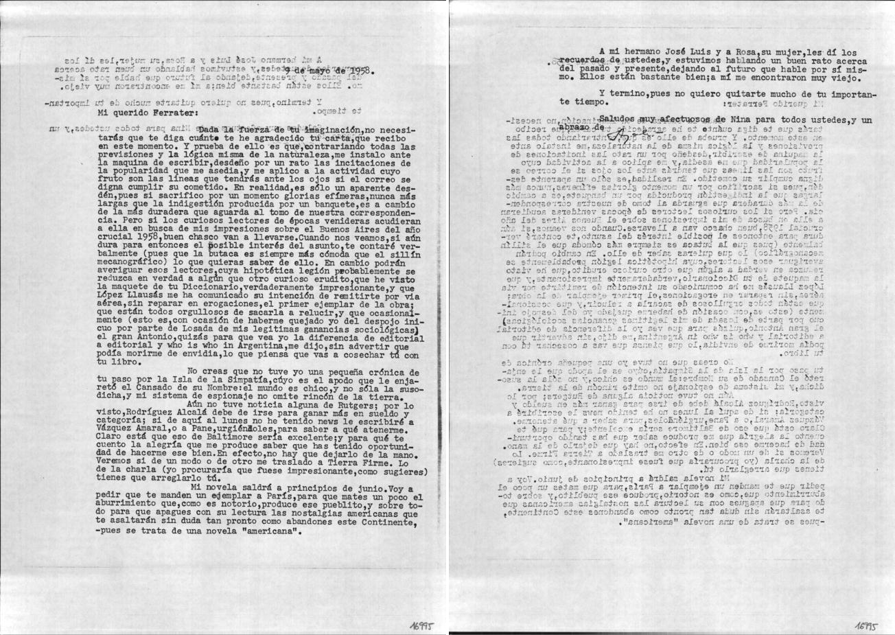 Dada la fuerza de tu imaginación, no necesitarás que te diga cuánto te he agradecido tu carta, que recibo en este momento. Y prueba de ello es que, contrariando todas las previsiones y la lógica misma de la naturaleza, me instalo ante la maquina de escribir, desdeño por un rato las incitaciones de la popularidad que me asedia, y me aplico a la actividad cuyo fruto son las lineas que tendrás ante los ojos si el correo se digna cumplir su cometido. En realidad, es sólo un aparente desdén, pues si sacrifico por un momento glorias efímeras, nunca más largas que la indigestión producida por un banquete, es a cambio de la más duradera que aguarda al tomo de nuestra correspondencia. Pero si los curiosos lectores de épocas venideras acudieran a ella en busca de mis impresiones sobre el Buenos Aires del año crucial de 1958, buen chasco van a llevarse. Cuando nos veamos, si aún dura para entonces el posible interés del asunto, te contaré verbalmente (pues que la butaca es siempre más cómoda que el sillín mecanográfico) lo que quieras saber de ello. En cambio podrán averiguar esos lectores, cuya hipotética legión probablemente se reduzca en verdad a algún que otro curioso erudito, que he visto la maquete [sic] de tu Diccionario, verdaderamente impresionante, y que López Llausás me ha comunicado su intención de remitirte por via aérea, sin reparar en erogaciones, el primer ejemplar de la obra; que están todos orgullosos de sacarla a relucir, y que ocasionalmente (esto es, con ocasión de haberme quejado yo del despojo inicuo por parte de Losada de mis legitimas ganancias sociológicas) el gran Antonio, quizás para que vea yo la diferencia de editorial a editorial y who is who in Argentina, me dijo, sin advertir que podía morirme de envidia, lo que piensa que vas a cosechar tú con tu libro.