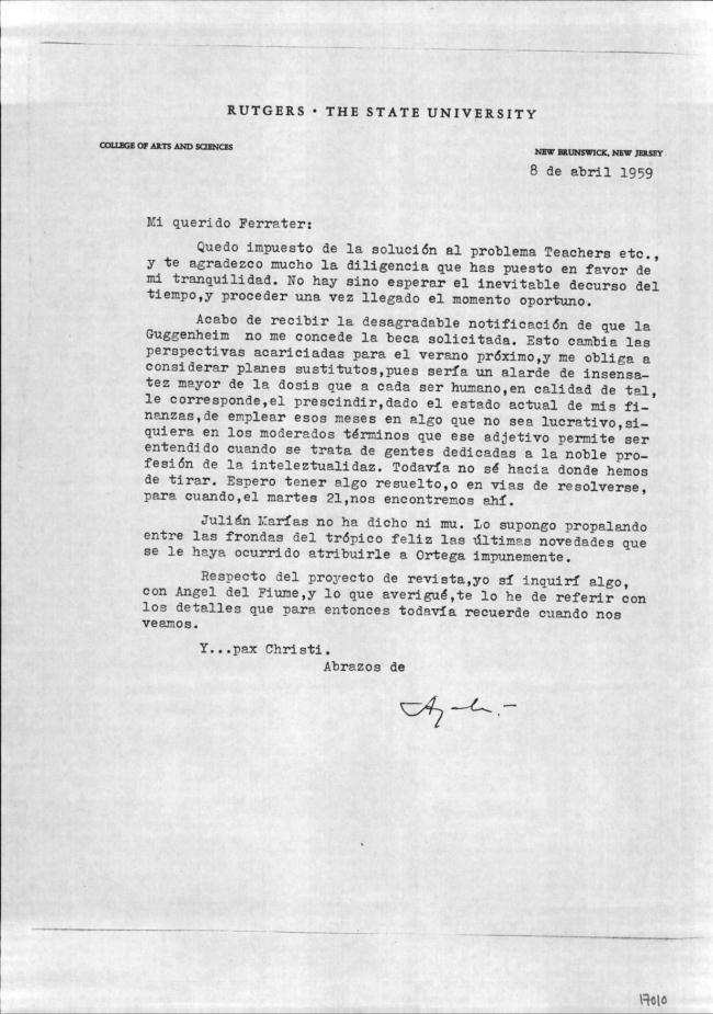 [Carta mecanografiada con firma autógrafa y con membrete:] RUTGERS, THE STATE UNIVERSITY / COLLEGE OF ARTS AND SCIENCES / NEW BRUNSWICK, NEW JERSEY