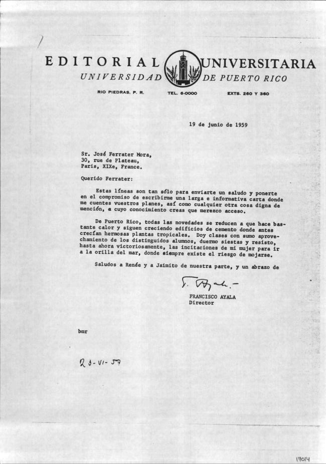 Carta de Francisco Ayala a José M.ª Ferrater Mora (19/06/1959)