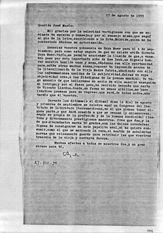 Anuncias vuestra presencia en Bryn Mawr para el 4 de septiembre; pero como estoy seguro de que no existe avión directo Bryn Mawr-París, me permito acariciar la ilusión de que, a vuestro paso por esta importante urbe de New York, os digneis honrar nuestra humilde casa y mesa, dándonos con ello oportunidad para, entre otras muchas cosas, conocer tu impresión acerca de la liberalización de la vieja Madre Patria, añadiendo con ello las informaciones nacidas de la subjetividad, únicas en cuya objetividad creo, a las fidedignas de la prensa mundial. Tu vago anuncio de que hablaremos en serio de ello suscitó enseguida mi intriga; y por si fuera poco, he recibido después una carta de Vicente Llorens, donde, en forma no menos sibilina, me hace idéntica promesa para su regreso, que será, de todos modos, más tardío que el vuestro.
