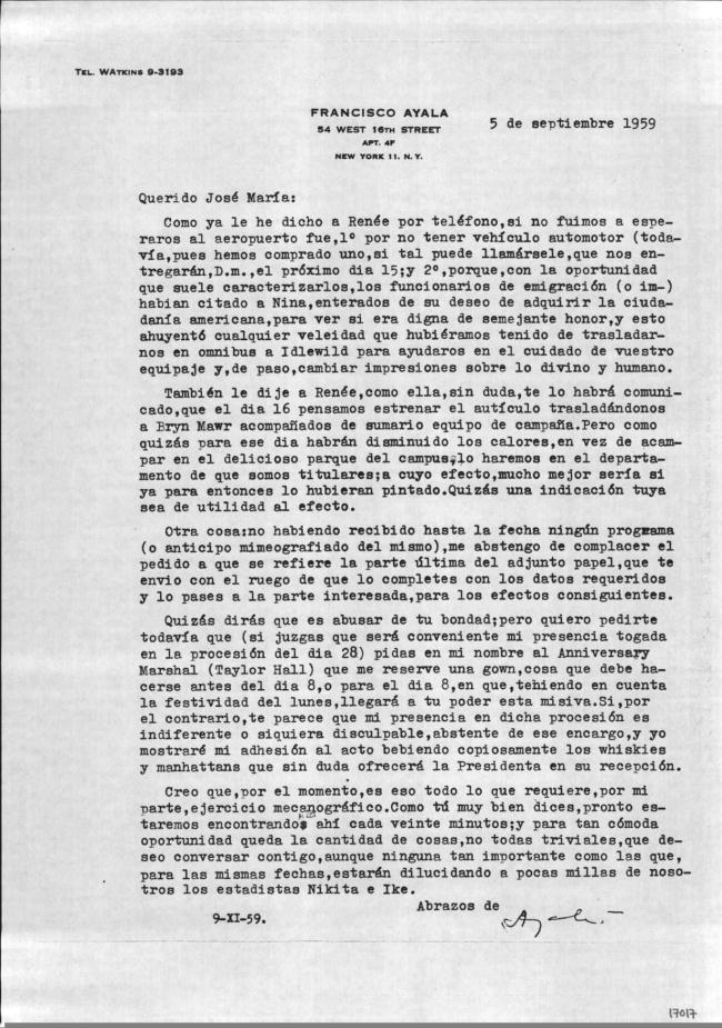 [Carta mecanografiada con firma autógrafa y con membrete:] FRANCISCO AYALA / 54 WEST 16TH STREET / APT. 4F / NEW YORK 11 N. Y.