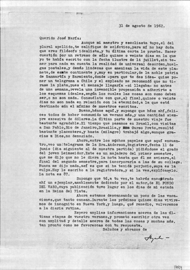 Carta de Francisco Ayala a José M.ª Ferrater Mora (31/08/1962)