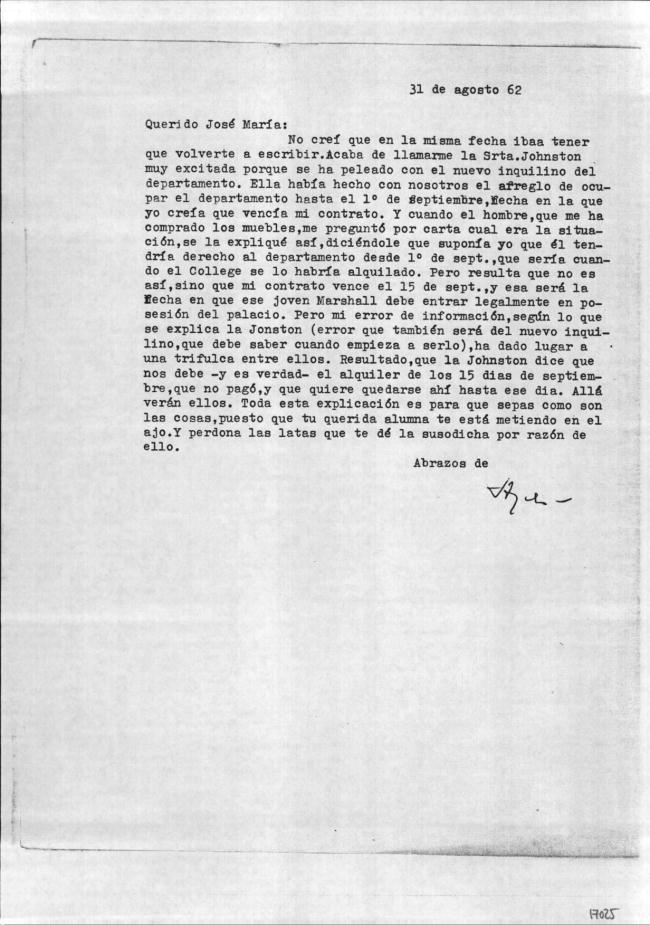 No creí que en la misma fecha ibaa [sic] tener que volverte a escribir. Acaba de llamarme la Srta. Johnston muy excitada porque se ha peleado con el nuevo inquilino del departamento. Ella había hecho con nosotros el arreglo de ocupar el departamento hasta el 1º de septiembre, fecha en la que yo creía que vencía mi contrato. Y cuando el hombre, que me ha comprado los muebles, me preguntó por carta cual era la situación, se la expliqué así, diciéndole que suponía yo que él tendría derecho al departamento desde 1º de sept., que sería cuando el College se lo habría alquilado. Pero resulta que no es así, sino que mi contrato vence el 15 de sept. y esa será la fecha en que ese joven Marshall debe entrar legalmente en posesión del palacio. Pero mi error de información, según lo que se explica la Johnston (error que también será del nuevo inquilino, que debe saber cuando empieza a serlo), ha dado lugar a una trifulca entre ellos. Resultado, que la Johnston dice que nos debe –y es verdad– el alquiler de los 15 dias de septiembre, que no pagó, y que quiere quedarse ahí hasta ese dia. Allá verán ellos. Toda esta explicación es para que sepas como son las cosas, puesto que tu querida alumna te está metiendo en el ajo. Y perdona las latas que te dé la susodicha por razón de ello.