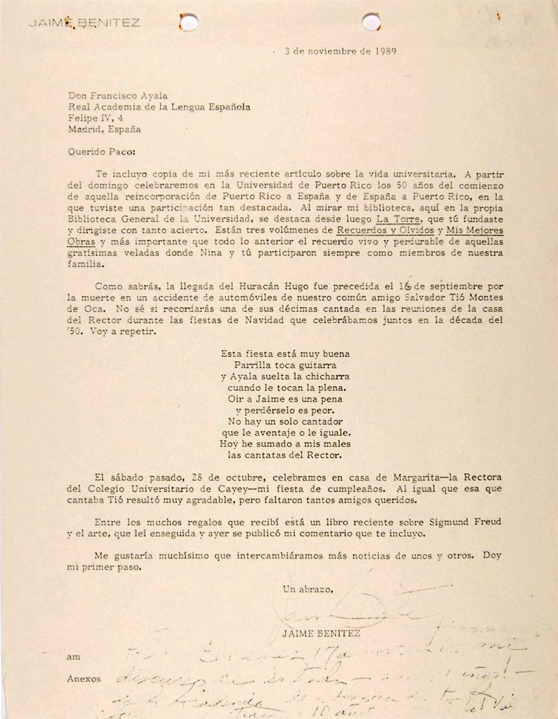 Carta de Jaime Benítez a Francisco Ayala (03/11/1989)