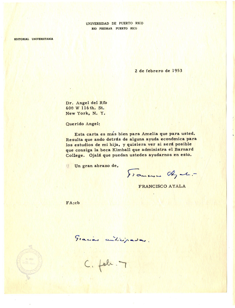 Carta de Francisco Ayala a Ángel del Río (27/03/1952)