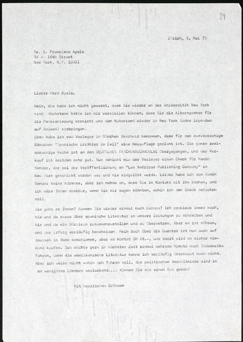 Nein, das habe ich nicht gewusst, dass Sie wieder an der Universität New York sind. Höchstens hätte ich mir vorstellen können, dass Sie die Altersgrenze für die Pensionierung erreicht und den Ruhestand wieder in New York (oder irgendwo auf Reisen) verbringen. Eben habe ich vom Verleger in München Bescheid bekommen, dass für das zweisprachige Bändchen "Spanische Erzähler im Exil" eine Neuauflage geplant ist. Die ganze zweisprachige Reihe ist an den DEUTSCHEN TASCHENBUCHVERLAG übergegangen, und der Verkauf ist seitdem sehr gut. Nun schickt mir der Verleger einen Check für Ramón Sender, der bei der Veröffentlichung an "Las Américas Publishing Company" in New York geschickt worden war und nie eingelöst wurde. Leider habe ich von Ramón Sender keine Adresse, aber ich nehme an, dass Sie in Kontakt mit ihm stehen, und ich wäre Ihnen dankbar, wenn Sie mir sagen könnten, wohin ich den Check schicken soll.