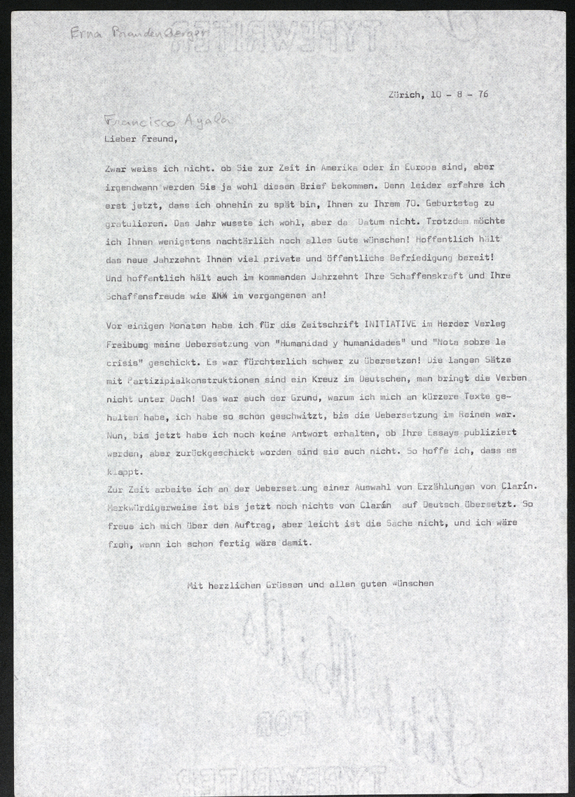 Carta de Erna Brandenberger a Francisco Ayala (10/08/1976)