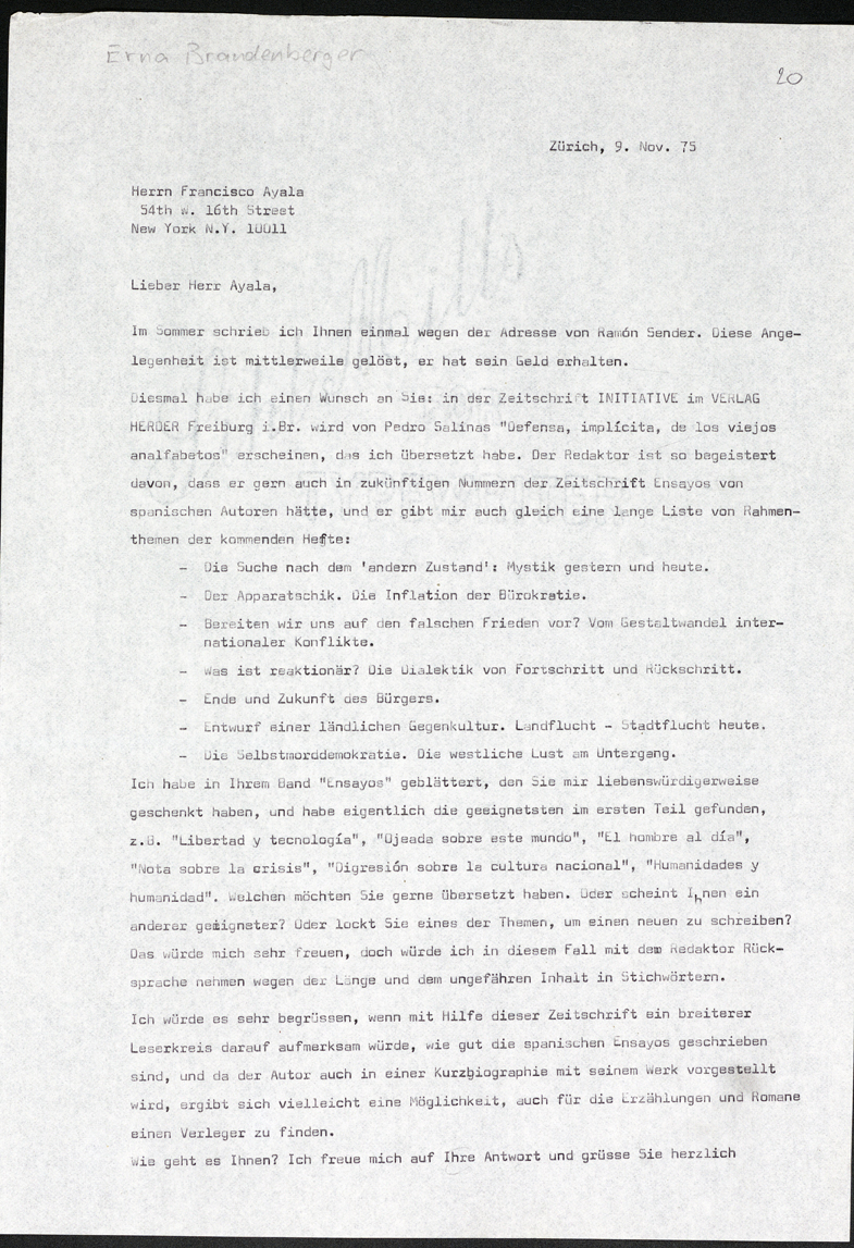 Carta de Erna Brandenberger a Francisco Ayala (09/11/1975)