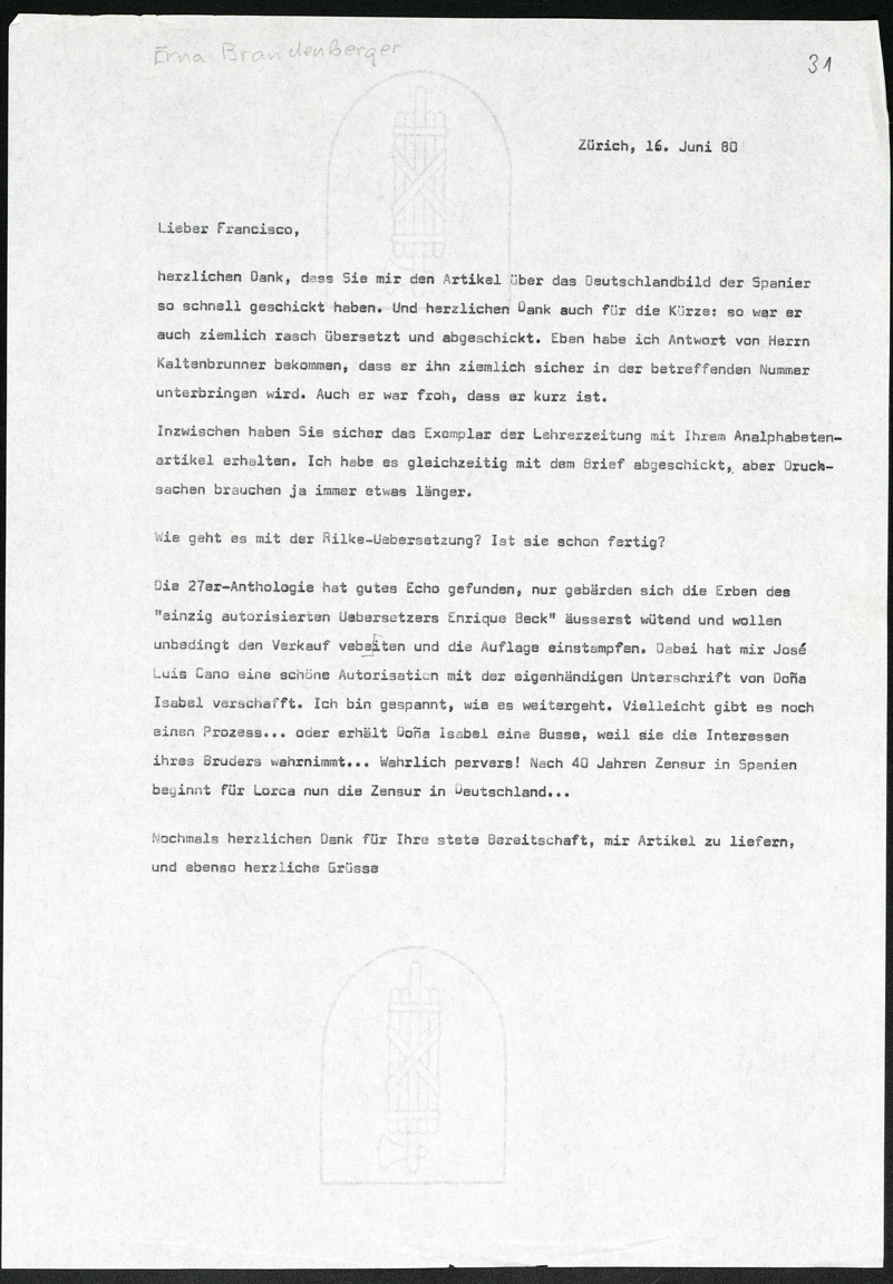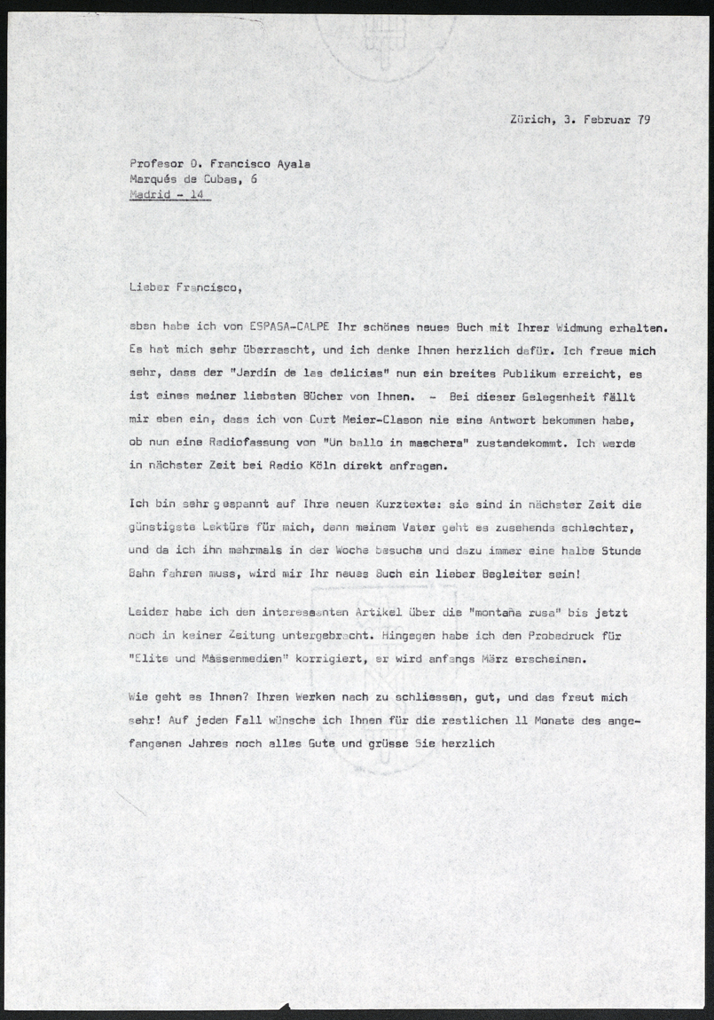 Wenn ich mich recht erinnere, habe ich im letzten Brief vergessen, Ihnen zu sagen, dass ich die Sondernummer Cuadernos Hispanoamericanos endlich auch bekommen habe. Ich hätte nie gedacht, dass sie so umfangreich und reichhaltig würde. Es ist nicht nur im Papiergewicht ein gewichtiges Werk geworden. Ich gratuliere Ihnen dazu. Diese Woche habe ich zu meiner Ueberraschung auch noch einen Scheck von 4000 Ptas bekommen, und dabei habe ich ihnen doch geschrieben, ich wolle kein Geld dafür, denn Sie hätten ja die Arbeit gemacht. Leider ist der Scheck in Schweizerfranken auf eine Schweizer Bank ausgestellt, sonst hätte ich ihn Ihnen geschickt. Beim jetzigen Wechselkurs sind allerdings nur noch wenige Franken übrig geblieben... Wenn Sie gern ein schönes Buch oder etwas anderes aus der Schweiz hätten, schicke ich es Ihnen gern.