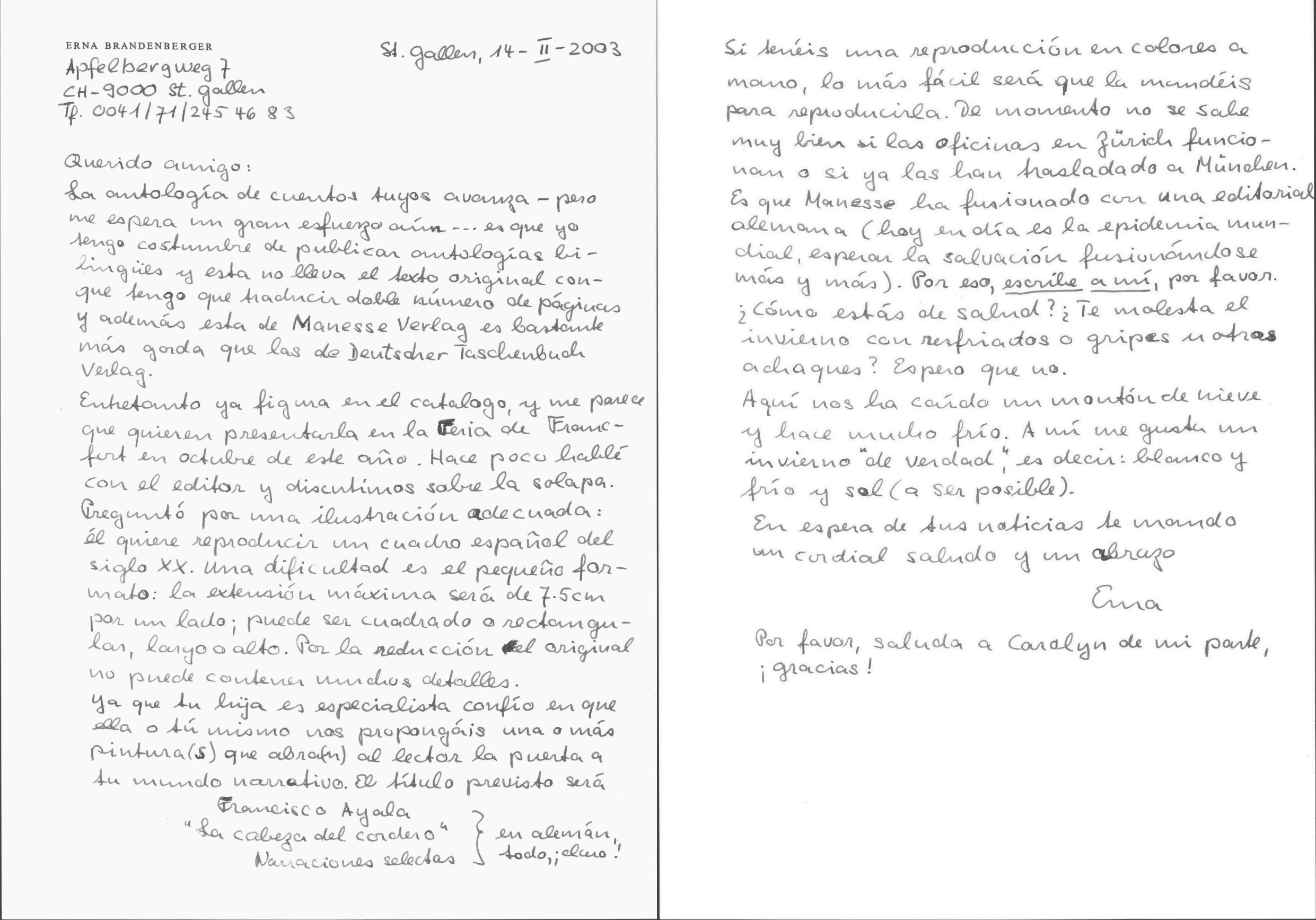 Carta de Erna Brandenberger a Francisco Ayala (14/02/2003)