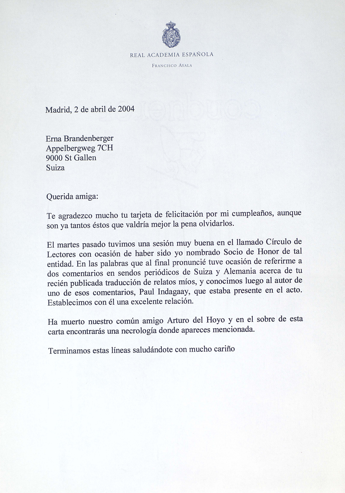 Carta de Francisco Ayala a Erna Brandenberger (02/04/2004)