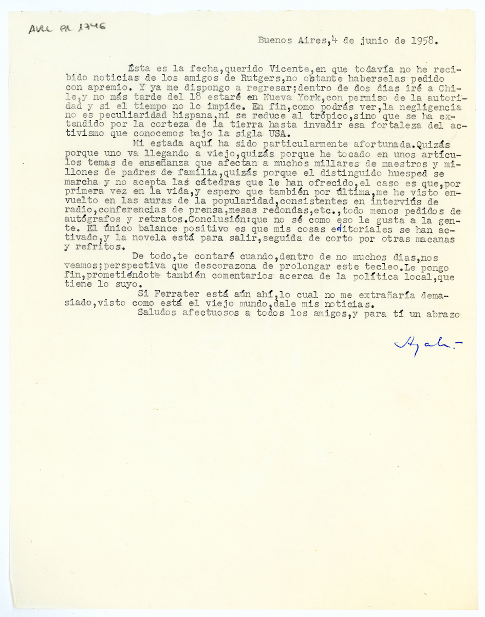 Ésta es la fecha, querido Vicente, en que todavía no he recibido noticias de los amigos de Rutgers, no ostante [sic] haberselas pedido con apremio. Y ya me dispongo a regresar; dentro de dos dias iré a Chile, y no más tarde del 18 estaré en Nueva York, con permiso de la autoridad y si el tiempo no lo impide. En fin, como podrás ver, la negligencia no es peculiaridad hispana, ni se reduce al trópico, sino que se ha extendido por la corteza de la tierra hasta invadir esa fortaleza del activismo que conocemos bajo la sigla USA.