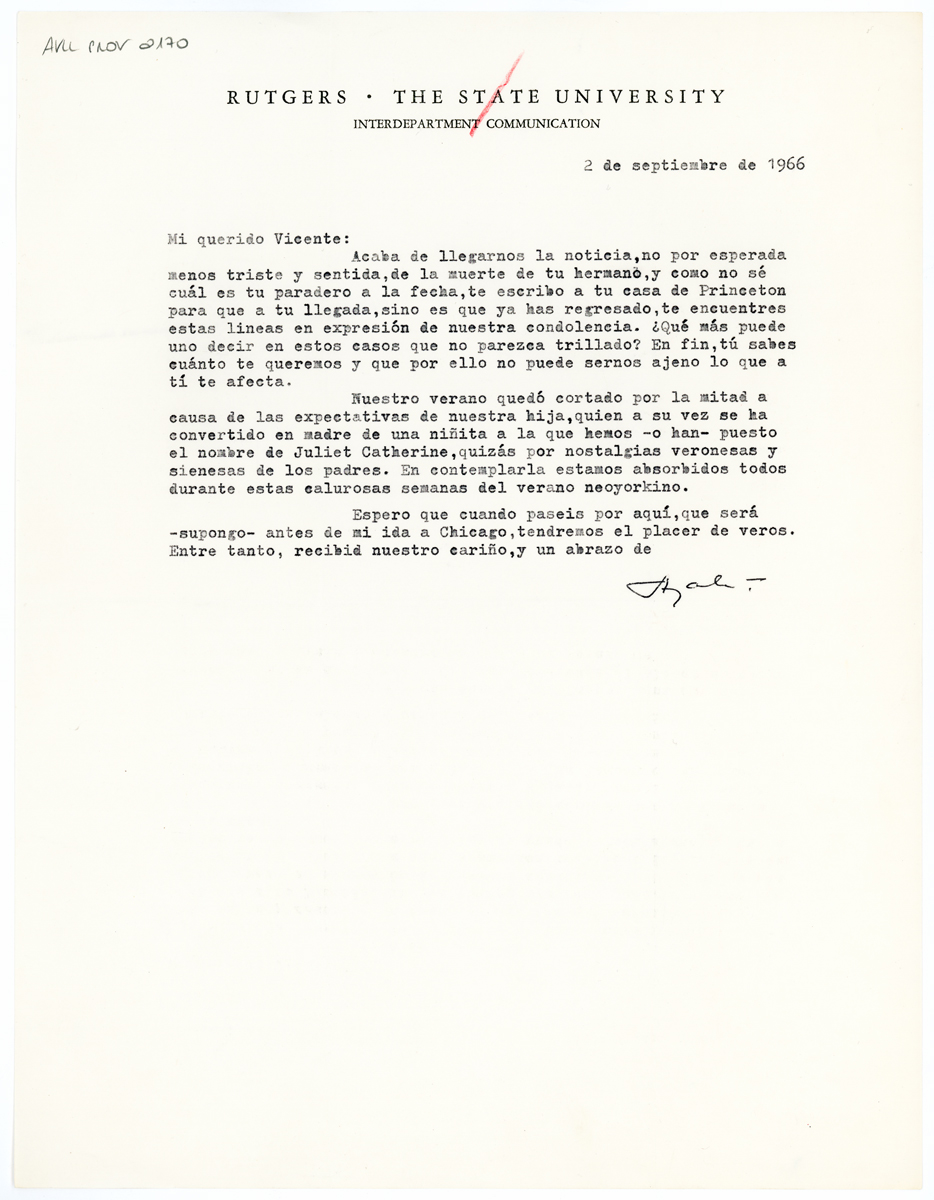 Acaba de llegarnos la noticia, no por esperada menos triste y sentida, de la muerte de tu hermano, y como no sé cuál es tu paradero a la fecha, te escribo a tu casa de Princeton para que a tu llegada, sino es que ya has regresado, te encuentres estas lineas en expresión de nuestra condolencia. ¿Qué más puede uno decir en estos casos que no parezca trillado? En fin, tú sabes cuánto te queremos y que por ello no puede sernos ajeno lo que a tí te afecta.