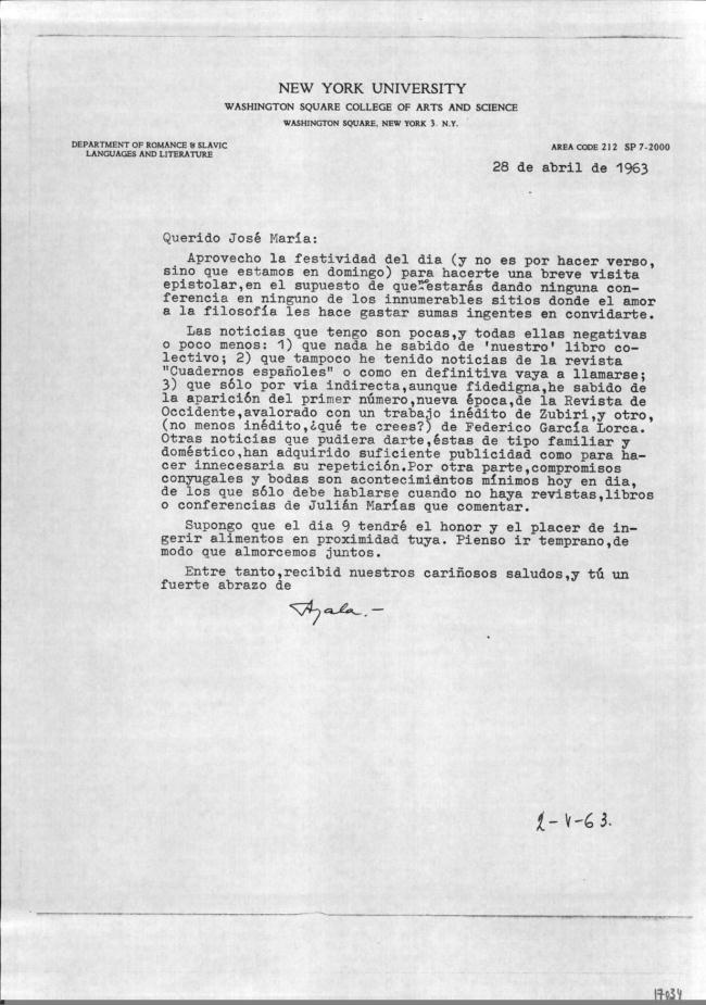 Carta de Francisco Ayala a José M.ª Ferrater Mora (28/04/1963)