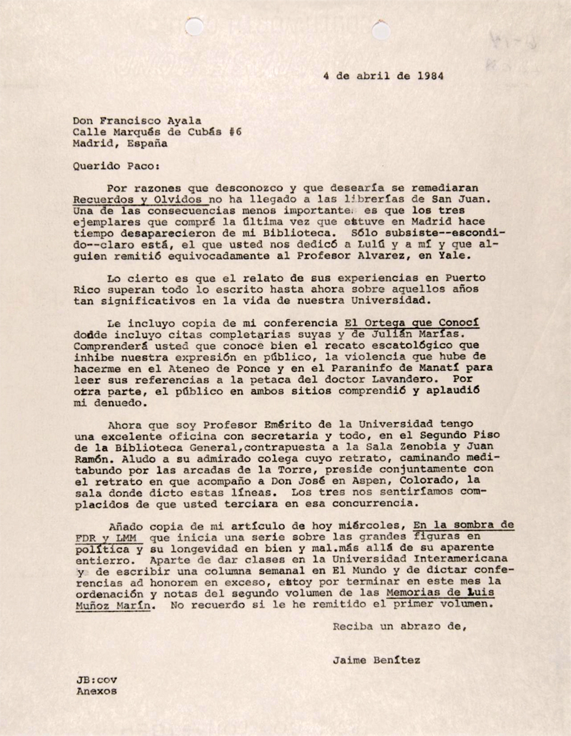 Carta de Jaime Benítez a Francisco Ayala (04/04/1984)