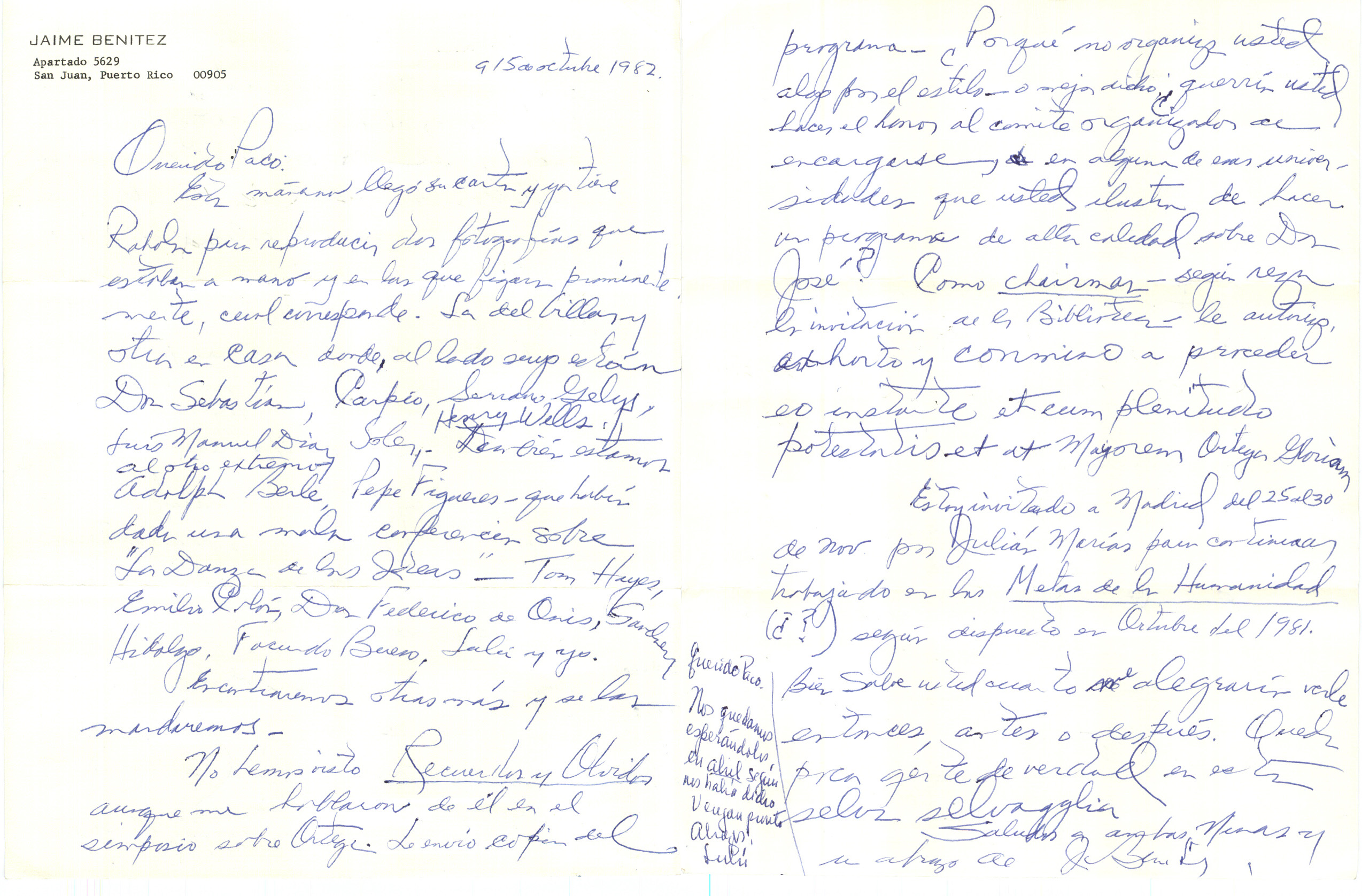 Estoy invitado a Madrid del 25 al 30 de nov por Julián Marías para continuar trabajando en las Metas de la Humanidad (¿?) según dispuesto en Octubre del 1981. Bien sabe usted cuánto me alegraría verle entonces, antes o después. Queda poca gente de verdad en esta selva selvagglia [sic].