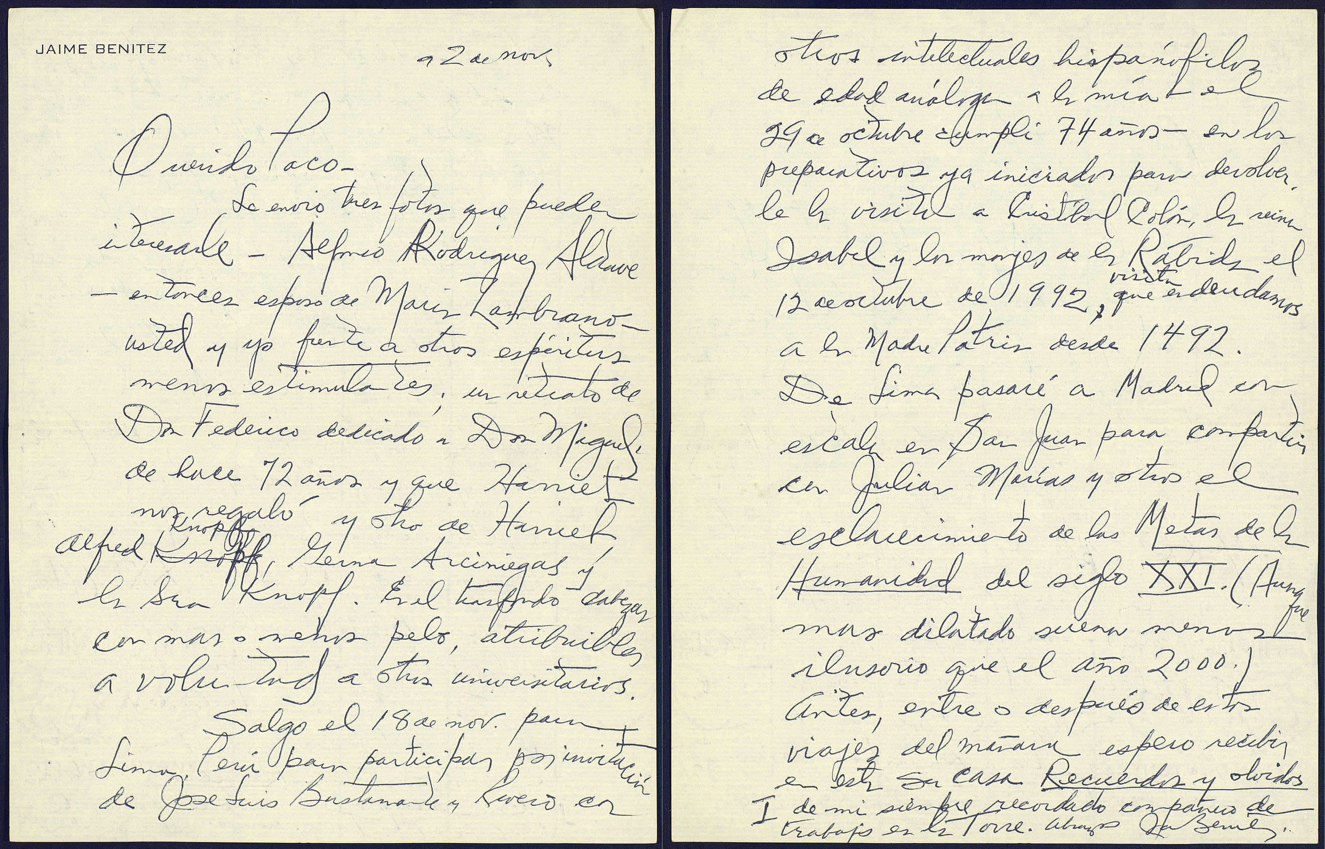 Salgo el 18 de nov para Lima, Perú, para participar por invitación de Jose Julio Bustamante y Rivero con otros intelectuales hispanófilos de edad análoga a la mía –el 29 de octubre cumplí 74 años– en los preparativos ya iniciados para devolver la visita a Cristóbal Colón, reina Isabel y los monjes de la Rábida el 12 de octubre de 1992, visita que endeudamos a la Madre Patria desde 1492.
