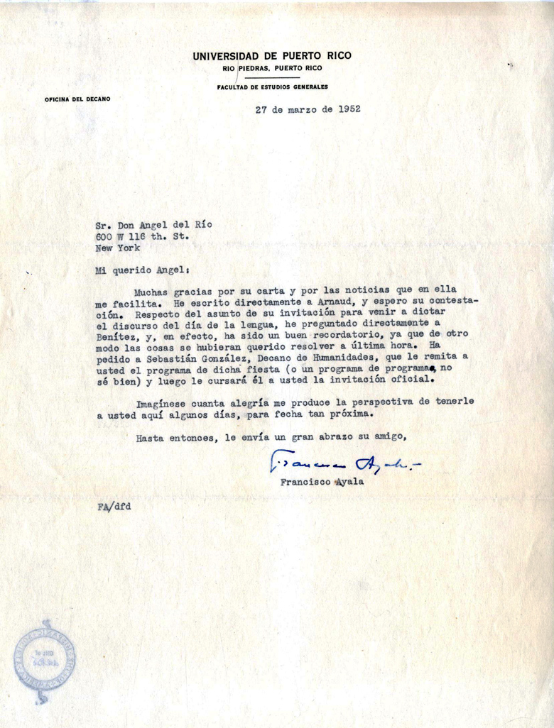 Carta de Francisco Ayala a Luis Muñoz Marín (21/01/1955)