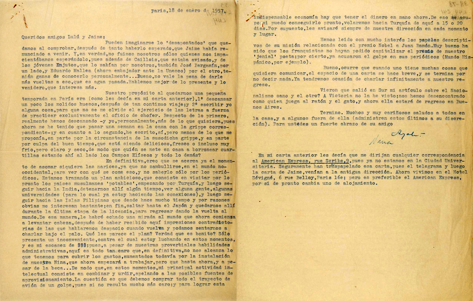 Hemos leido con mucho interés los papeles descriptivos de su misión relacionada con el premio Nobel a Juan Ramón. Muy bueno ha sido que los franquistas no hayan podido capitalizar el precio de nuestro “jenial” poeta; por cierto ya acusaron el golpe en sus periódicos (Mundo Hispánico, por ejemplo).