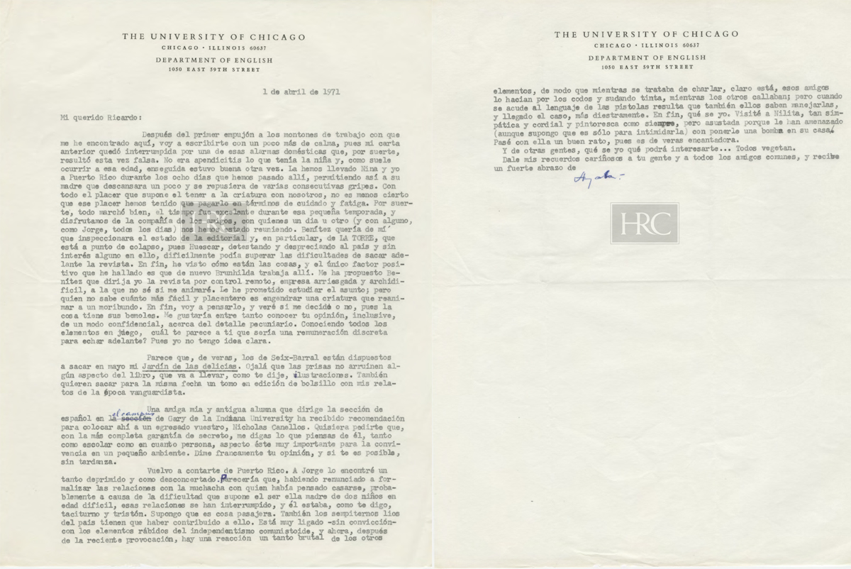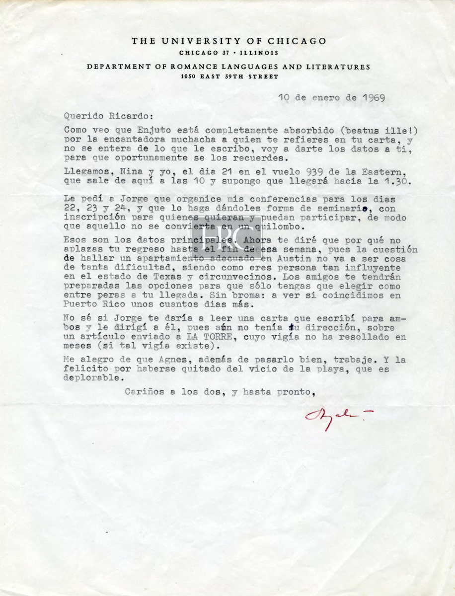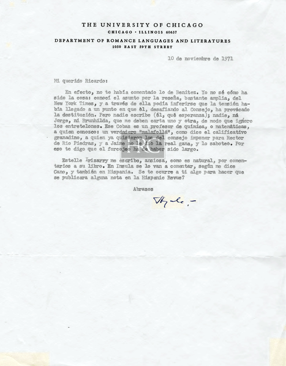 [Carta mecanografiada con firma autógrafa y con membrete:] THE UNIVERSITY OF CHICAGO / CHICAGO. ILLINOIS 60637 / DEPARTMENT OF ROMANCE LANGUAGES AND LITERATURES / 1050 EAST 59TH STREET