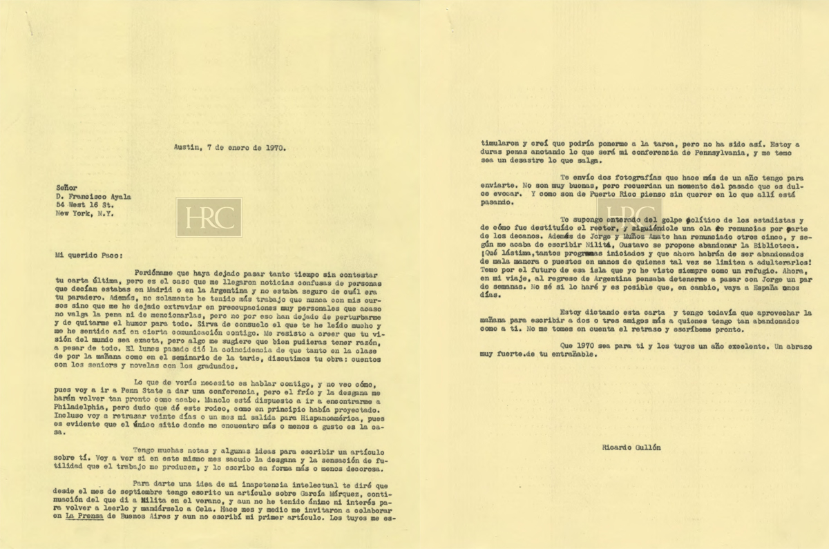 Carta de Ricardo Gullón a Francisco Ayala (07/01/1970)
