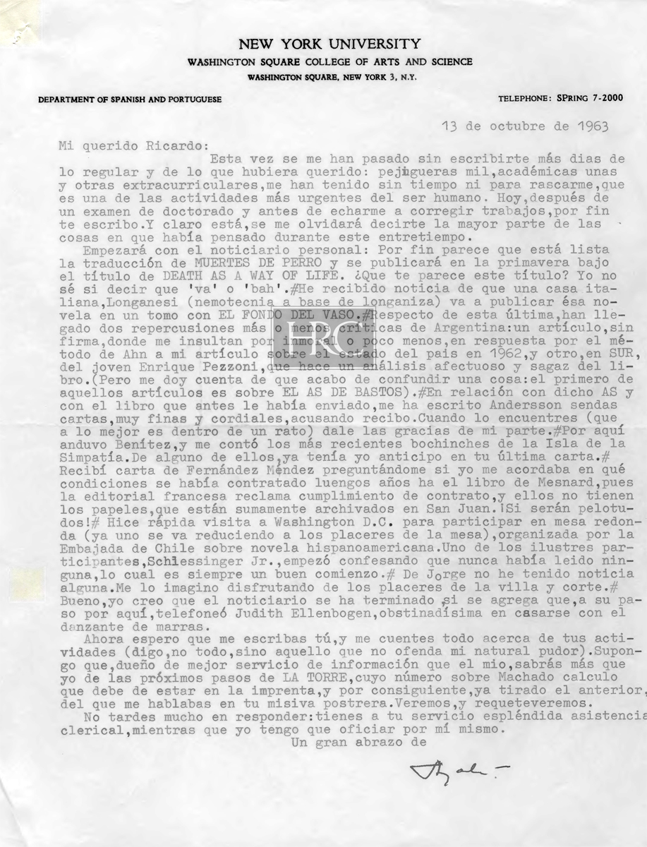 Carta de Francisco Ayala a Ricardo Gullón (13/10/1963)