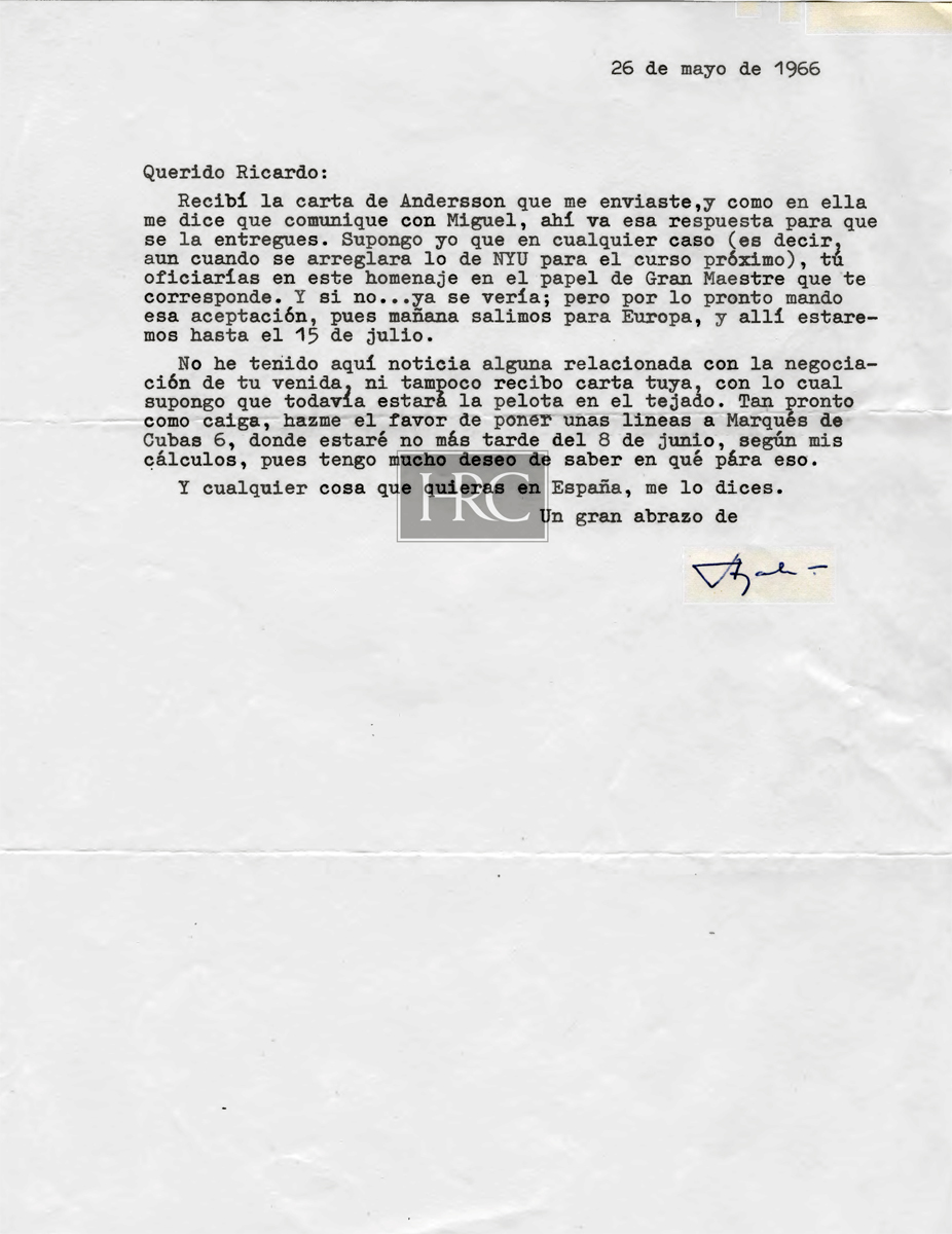 Recibí la carta de Andersson que me enviaste, y como en ella me dice que comunique con Miguel, ahí va esa respuesta para que se la entregues. Supongo yo que en cualquier caso (es decir, aun cuando se arreglara lo de NYU para el curso próximo), tu oficiarías en este homenaje en el papel de Gran Maestre que te corresponde. Y si no… ya se vería; pero por lo pronto mando esa aceptación, pues mañana salimos para Europa, y allí estaremos hasta el 15 de julio.