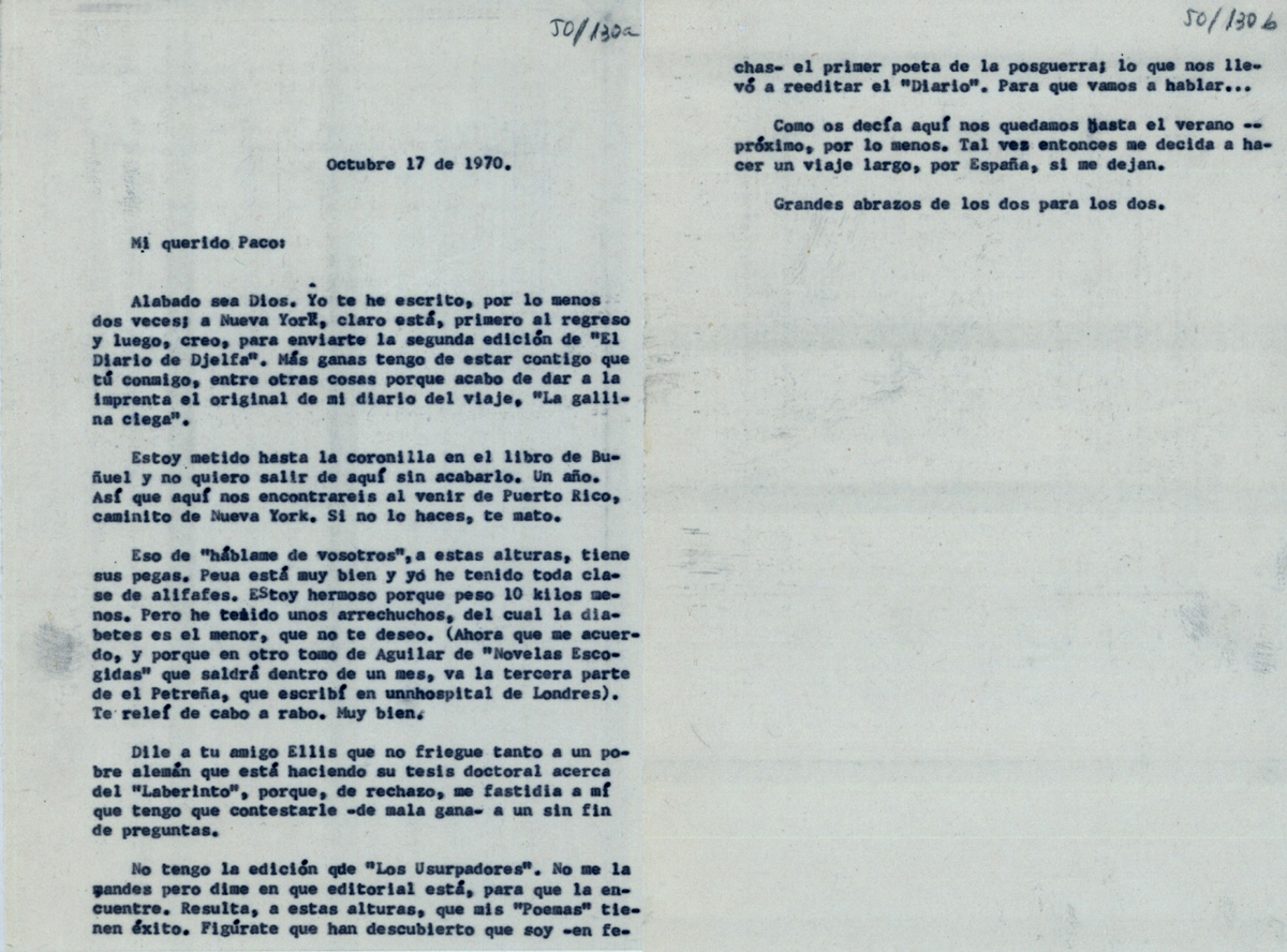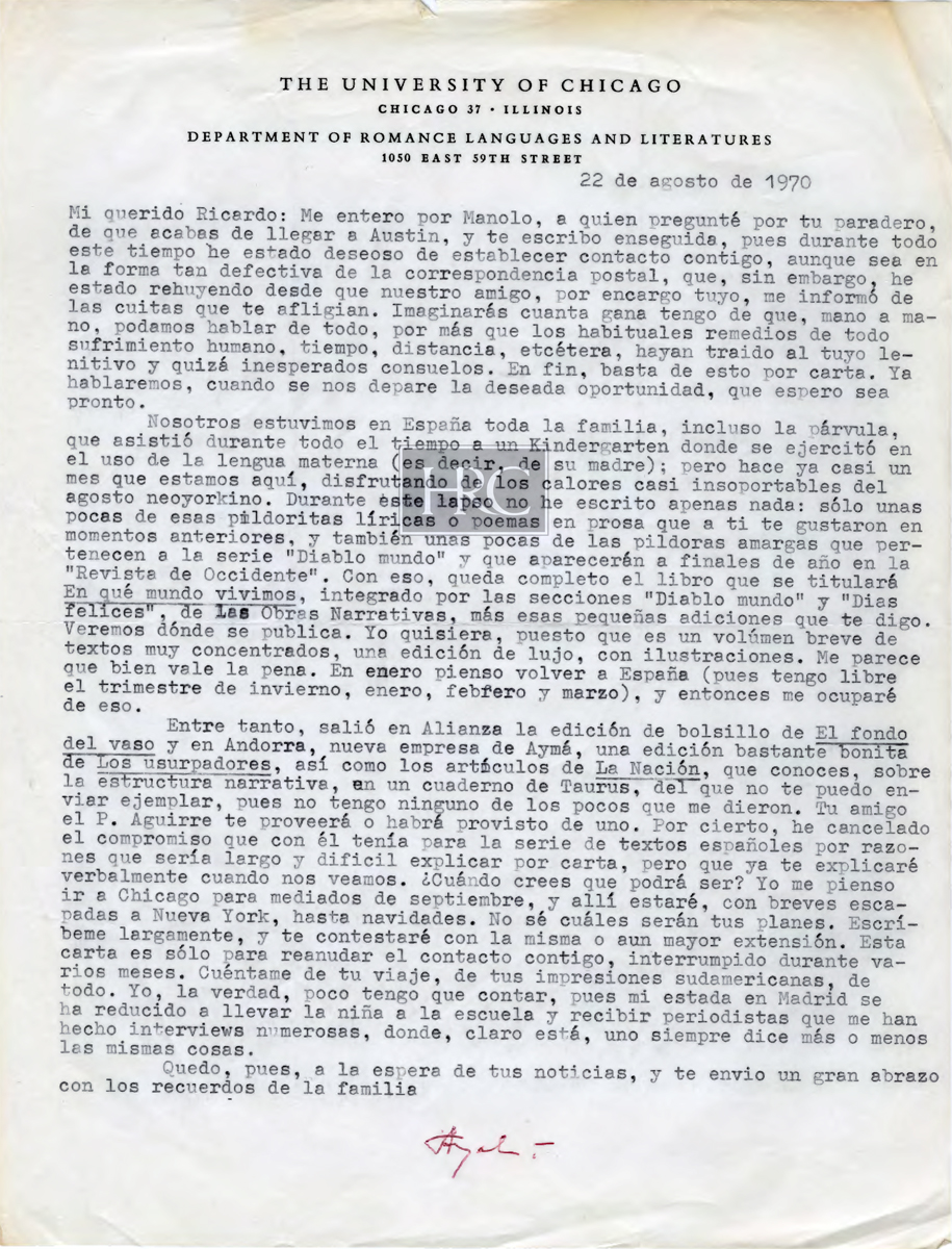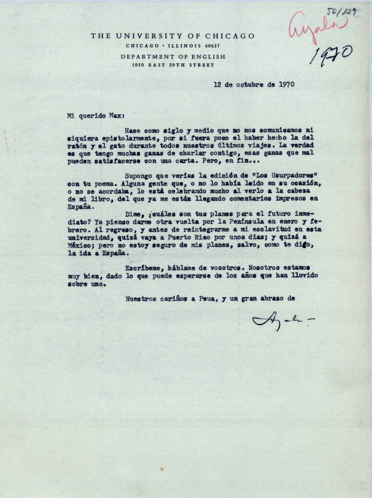 Disculpe que le conteste son algún retraso, motivado por mi deseo de dar un tiempo al tiempo, respecto a la edición de sus obras en “Aguilar”, de México. Me he puesto al habla con Arturo del Hoyo y me informa que ellos no han recibido ninguna comunicación. El no ve la cosa clara y su impresión es pesimista. Me dice también que le escribirán pronto sobre el particular. Imagínese, y ya sabe a quienes me refiero, la irritación que por mi parte debo dominar, pues creo que no se les debe hacer el juego, por lo que supongo será un aplazamiento. Como verá Vd., soy un optimista empedernido, de manera especial en lo que respecta a los buenos amigos.