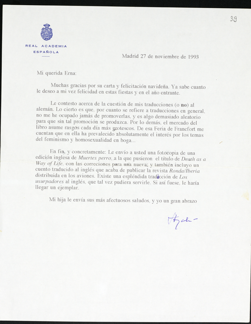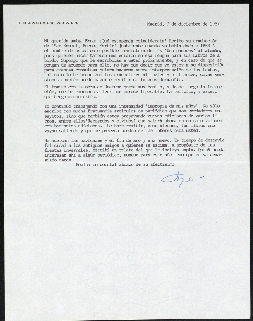 Mi querida amiga Erna: ¡Qué estupenda coincidencia! Recibo su traducción de 'San Manuel, Bueno, Martir' justamente cuando yo había dado a IBERIA el nombre de usted como posible traductora de mis 'Usurpadores' al alemán, pues quieren hacer también una edición en esa lengua para sus Libros de a bordo. Supongo que le escribirán a usted próximamente, y en caso de que se pongan de acuerdo para ello, no hay que decir que yo estoy a su disposición para cuantas consultas quiera hacerme sobre interpretación de los textos, tal como lo he hecho con los traductores al inglés y al francés, cuyas versiones también puedo hacerle remitir si lo considera útil.