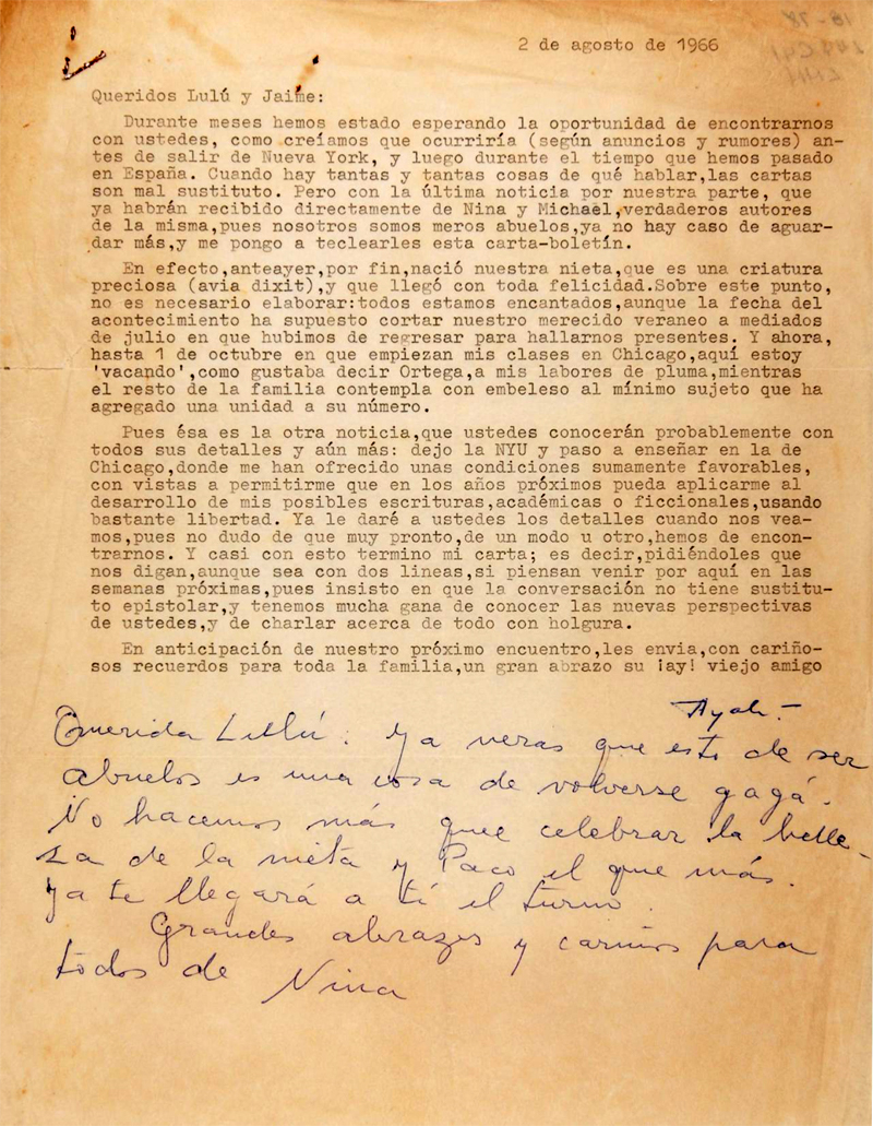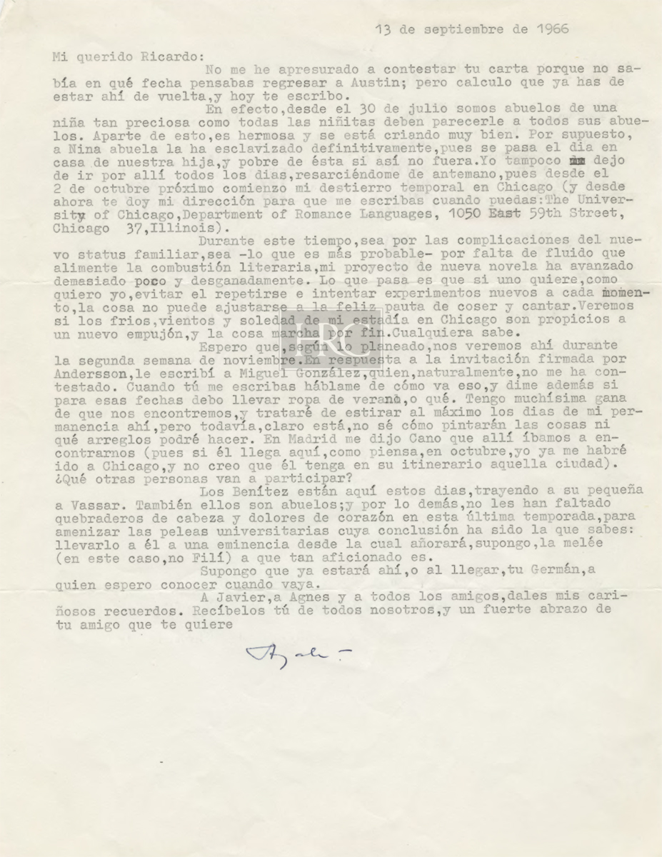 En efecto, desde el 30 de julio somos abuelos de una niña tan preciosa como todas las niñitas deben parecerle a todos sus abuelos. Aparte de esto, es hermosa y se está criando muy bien. Por supuesto, a Nina abuela la ha esclavizado definitivamente, pues se pasa el dia en casa de nuestra hija, y pobre de ésta si así no fuera. Yo tampoco dejo de ir por allí todos los dias, resarciéndome de antemano, pues desde el 2 de octubre próximo comienzo mi destierro temporal en Chicago (y desde ahora te doy mi dirección para que me escribas cuando puedas: The University of Chicago, Department of Romance Languages, 1050 East 59th Street, 37, Illinois).