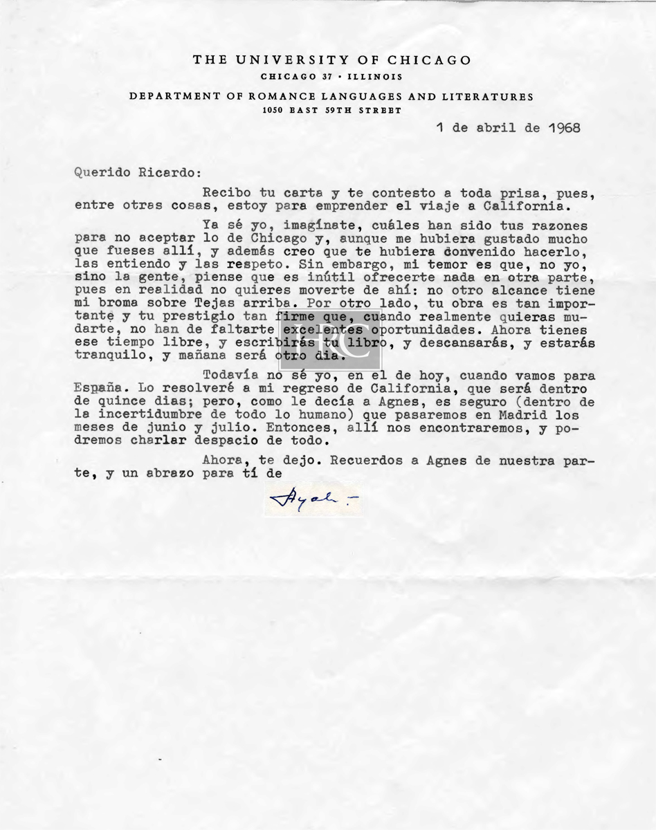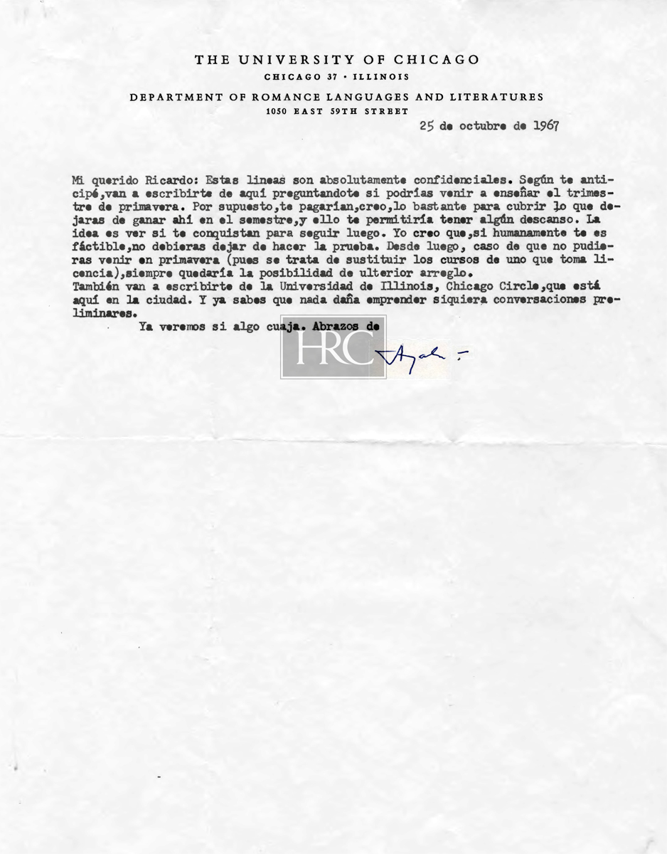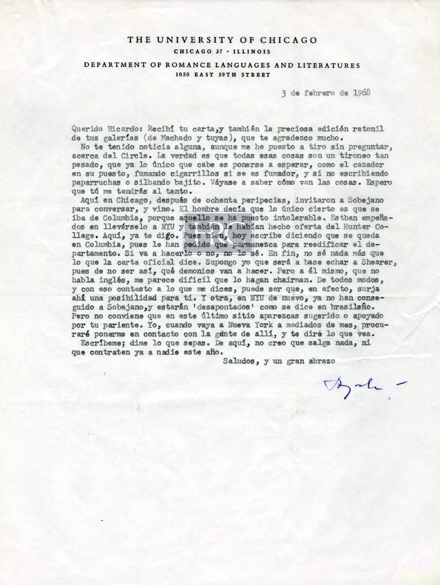 [Carta mecanografiada con firma autógrafa y con membrete:] THE UNIVERSITY OF CHICAGO / CHICAGO 37 - ILLINOIS / DEPARTMENT OF ROMANCE LANGUAGES AND LITERATURES / 1050 EAST 59TH STREET