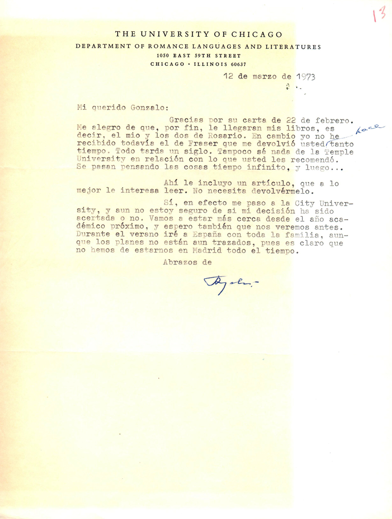 [Carta mecanografiada con firma autógrafa y con membrete:] THE UNIVERSITY OF CHICAGO / DEPARTMENT OF ROMANCE LANGUAGES AND LITERATURES / 1050 EAST 59TH STREET / CHICAGO. ILLINOIS 60637