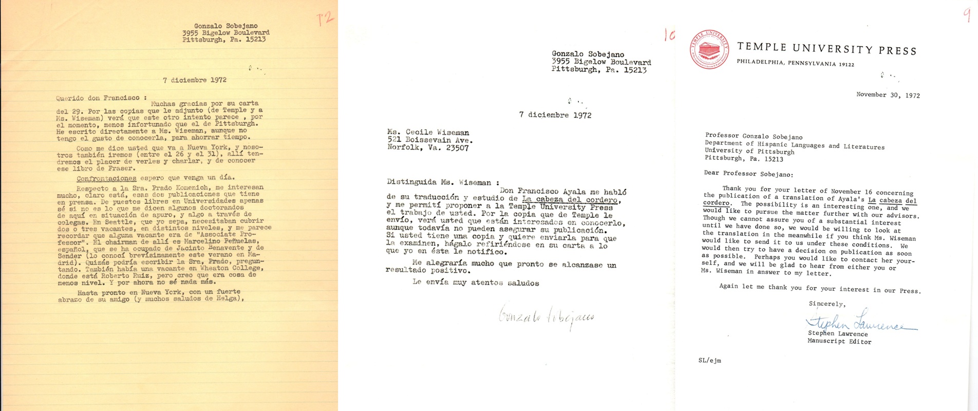 Encuentro su carta del dia 16 después de haber ido a pasar la fiesta del pavo con mi familia en Nueva York, y me apresuro a darle las gracias más efusivas por su diligencia en favor de la edición de mi libro. Veremos si están en Temple de publicarlo; ya me dirá lo que sepa, o más bien me dirá la Sra. Wiseman si le escriben o qué. También le agradezco las sugestiones acerca de otras University Presses.