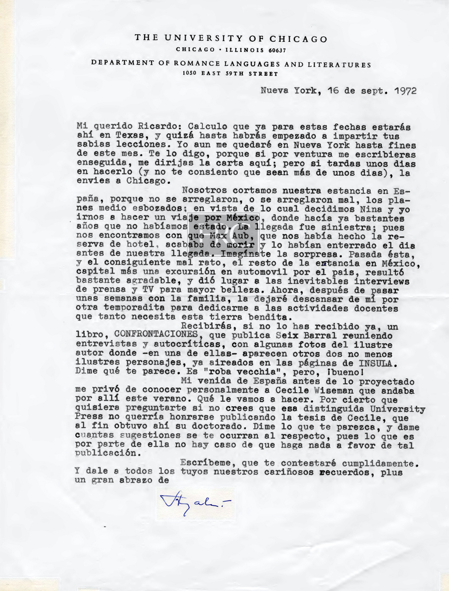 [Carta mecanografiada con firma autógrafa y con membrete:] THE UNIVERSITY OF CHICAGO / CHICAGO. ILLINOIS 60637 / DEPARTMENT OF ROMANCE LANGUAGES AND LITERATURES / 1050 EAST 59TH STREET