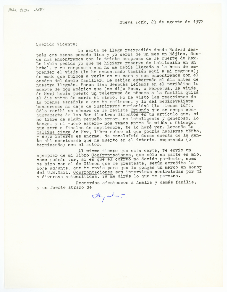 Tu carta me llega reexpedida desde Madrid después que hemos pasado Nina y yo cerca de un mes en Méjico, donde nos encontramos con la triste sorpresa de la muerte de Max. Le había pedido yo que me hiciera reserva de habitación en un hotel, y su respuesta aun no me había llegado a la hora de emprender el viaje (la he encontrado también aquí a mi regreso); de modo que fuimos a verlo en su casa y nos encontramos con el cuadro del duelo familiar. Le habían enterrado el dia antes de nuestra llegada. Pocos dias después leíamos en el periódico la muerte de don Américo que (me dijo Peua, o Perpetua, la viuda de Max) había puesto un telegrama de pésame a la familia quizá el dia antes de morir él mismo. No he visto las reacciones de la prensa española a que te refieres, y lo del medioevalista bonaerense no deja de inspirarme curiosidad (lo tienes tú?). Sólo recibí un número de la revista Triunfo que se ocupa conjuntamente de los dos ilustres difuntos en un artículo que, si no libre de algún pequeño error, es inteligente y generoso. Lo tengo, y si –como espero– nos vemos antes de mi ida a Chicago, que será a finales de septiembre, te lo haré ver. Leyendo La gallina ciega de Max, libro sobre el que podría hablarse tanto, y cuyo interés es enorme, da escalofrió darse cuenta de la gente ahí mencionada que ha muerto en el ínterin, empezando (o terminando) con el autor.
