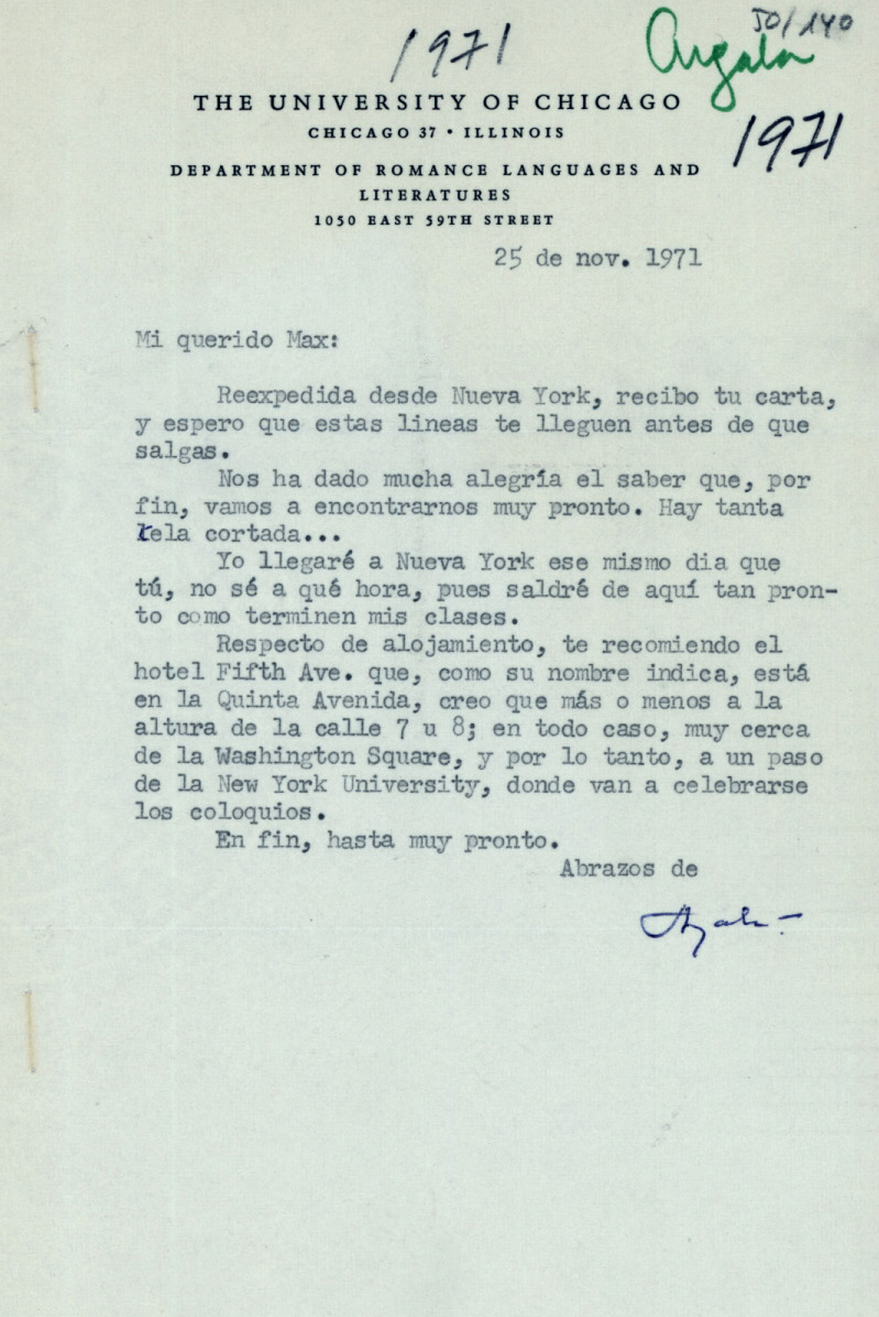 [Carta mecanografiada con firma autógrafa y con membrete:] THE UNIVERSITY OF CHICAGO / CHICAGO 37. ILLINOIS / DEPARTMENT OF ROMANCE LANGUAGES AND LITERATURES / 1050 EAST 59TH STREET