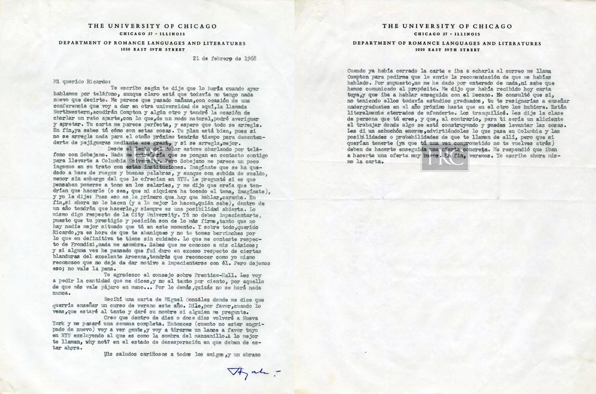 Aquí en Chicago, después de ochenta peripecias, invitaron a Sobejano para conversar, y vino. El hombre decía que lo único cierto es que se iba de Columbia, porque aquello se ha puesto intolerable. Estban [sic] empeñados en llevárselo a NYU y también le habían hecho oferta del Hunter College. Aquí, ya te digo. Pues bien, hoy escribe diciendo que se queda en Columbia, pues le han pedido que permanezca para reedificar el departamento. Si va a hacerlo o no, no lo sé. En fin, no sé nada más que lo que la carta oficial dice. Supongo yo que será a base echar [sic] a Shearer, pues de no ser así, qué demonios van a hacer. Pero a él mismo, que no habla inglés, me parece dificil que lo hagan chairman. De todos modos, y con eso contesto a lo que me dices, puede ser que, en efecto, surja ahí una posibilidad para ti. Y otra, en NYU de nuevo, ya no han conseguido a Sobejano, y estarán ‘desapontados’, como se dice en brasileño. Pero no conviene que en este último sitio aparezcas sugerido o apoyado por tu pariente. Yo, cuando vaya a Nueva York a mediados de mes, procuraré ponerme en contacto con la gente de allí, y te diré lo que vea.
